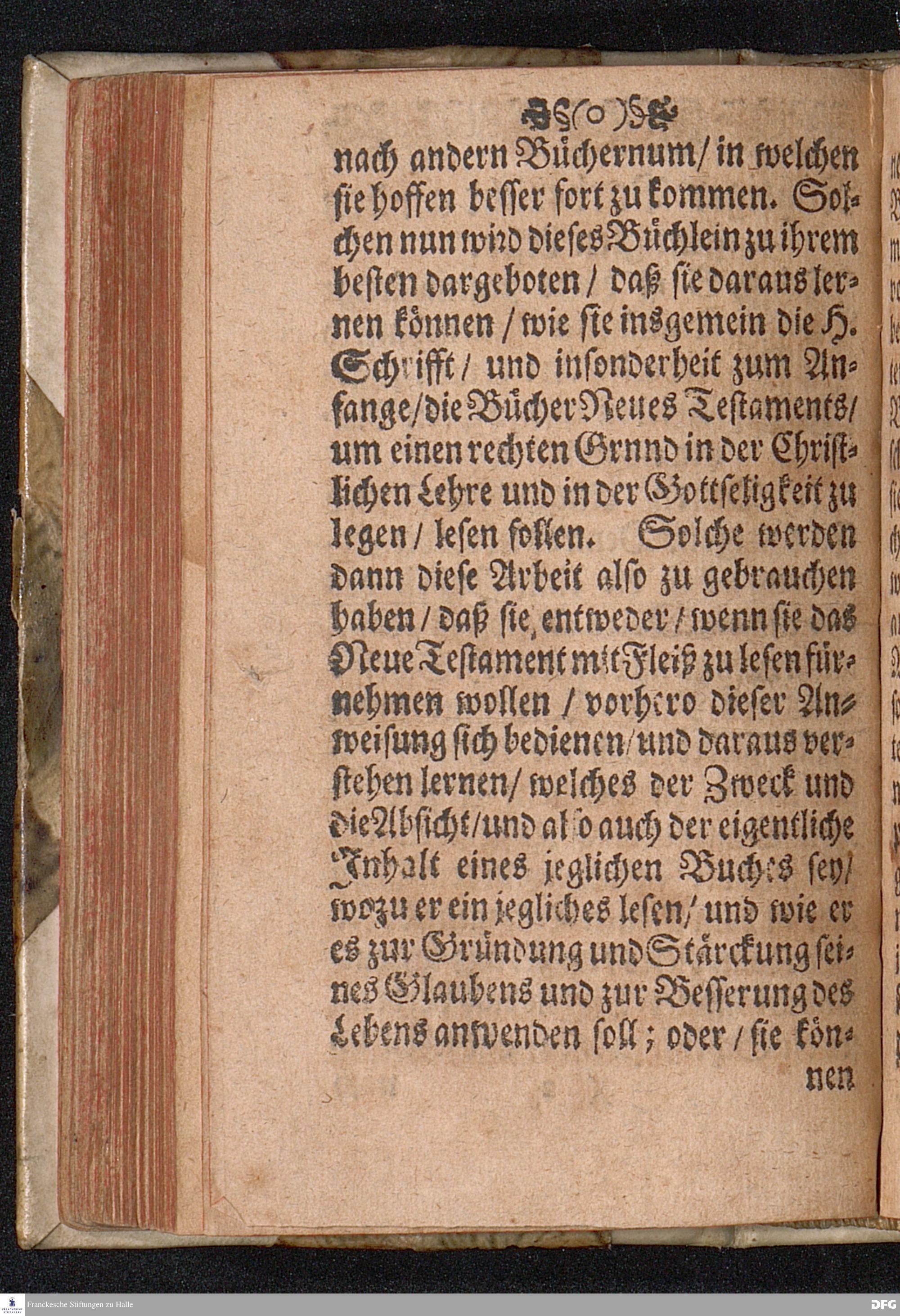 M. Aug. Hermann Franckens Gr.& Or.Lingg.P.P. & P.Glauch. Einleitung Zur Lesung Der H. Schrifft / Insonderheit Des Neuen Testaments. I. Für Ungelehrte u.Einfältige. II.Für Studiosos Theologiæ. III.Für Catechisirende. Darinnen Der Zweck und Inhalt der gantzen H.Schrifft / Fürnemlich aller und jeden Bücher Neues Testaments / und wie derselbe zur rechten Gründung in der Christlichen Lehre und Gottseligkeit anzuwenden sey / deutlich gezeiget wird. Halle / Gedruckt bey Christoph Salfelden. 1694.