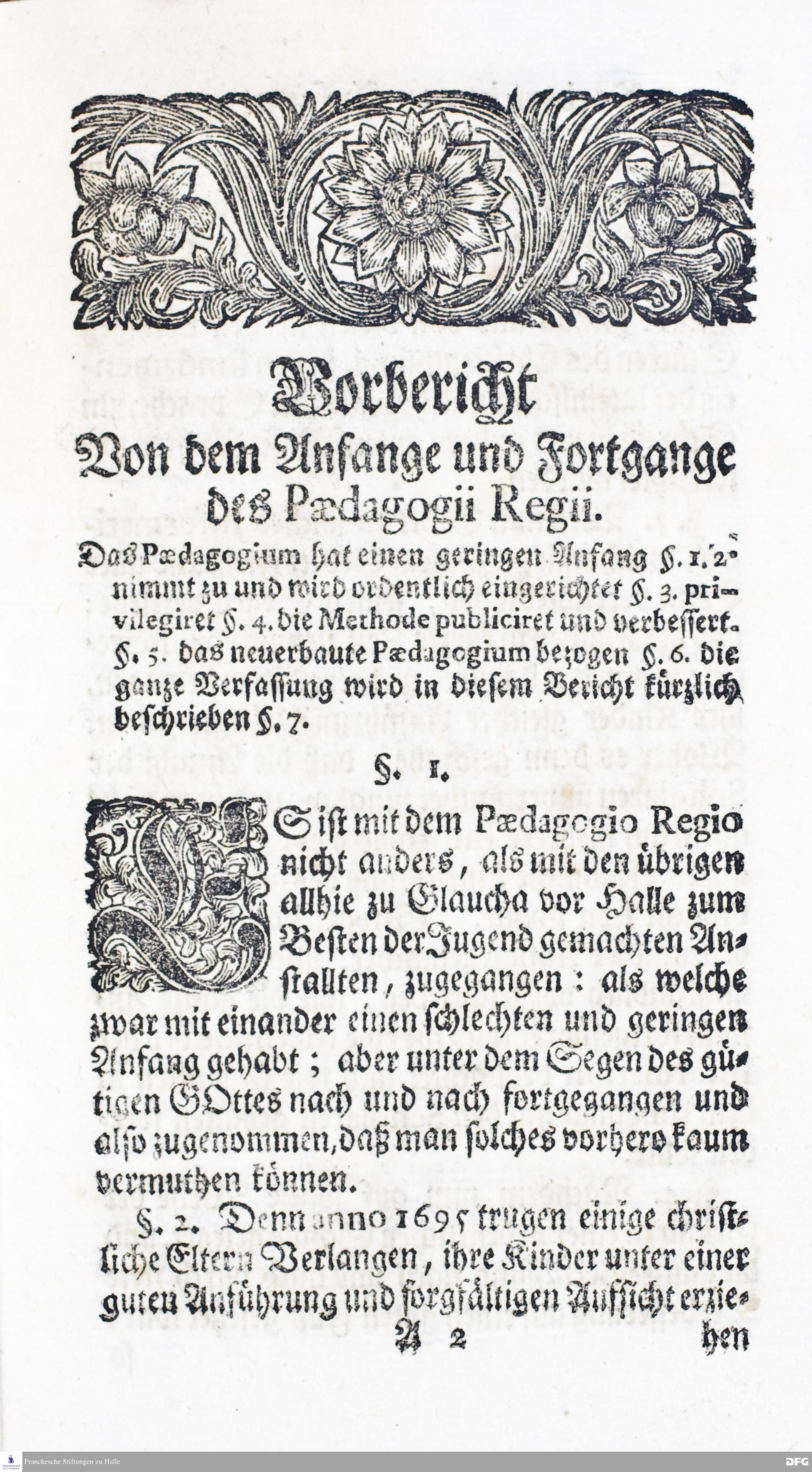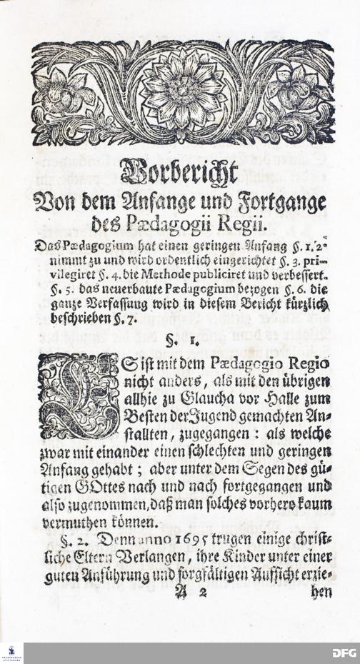 Kurzer Bericht Von der Gegenwärtigen Verfassung Des PAEDAGOGII REGII Zu Glaucha vor Halle / Aus der vormals schon edirten, nunmehro aber in vielen Stücken nach und nach verbesserten Ordnung und Lehrart herausgezogen. HALLE, Zu finden im Wäisenhause, MDCCXIV.
