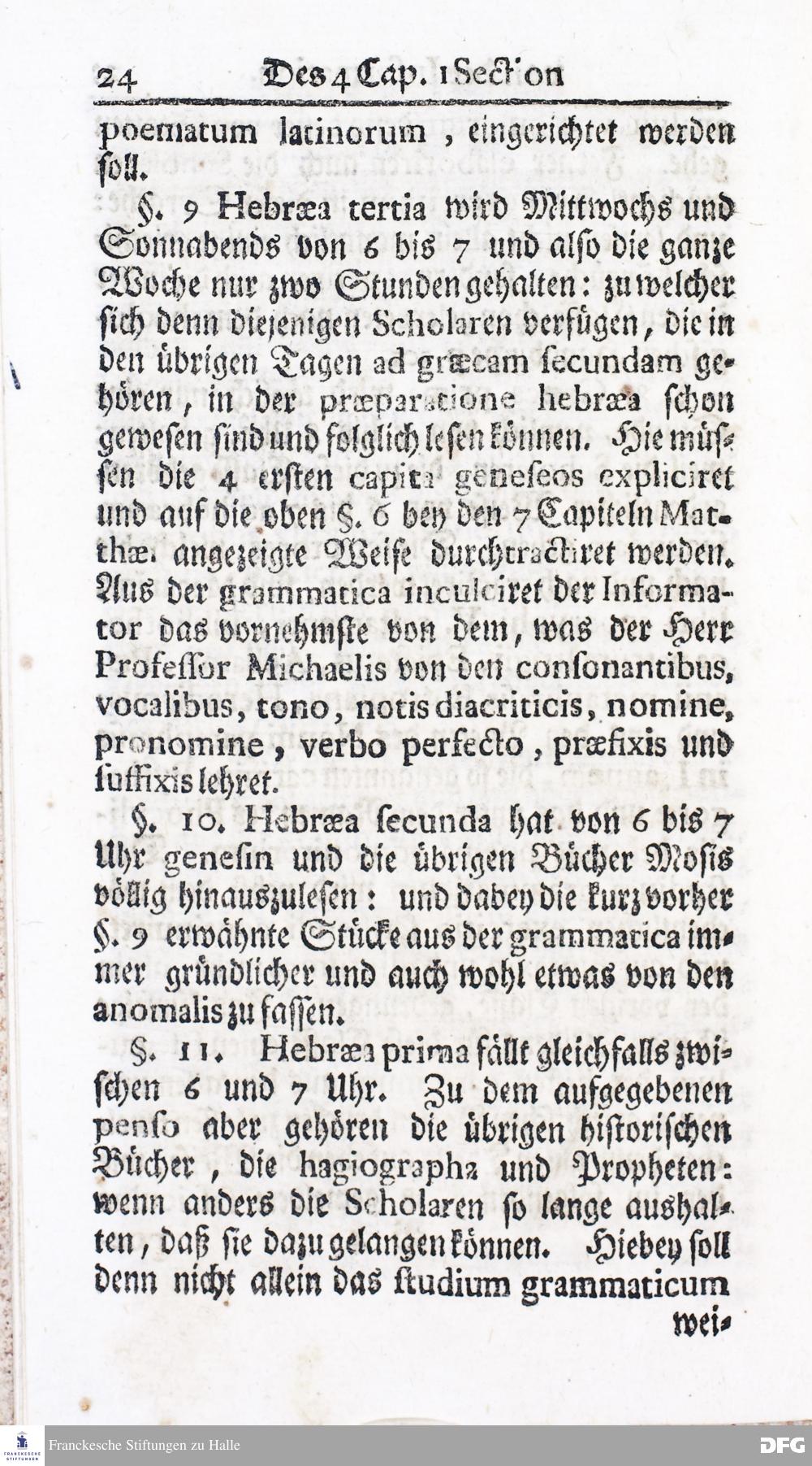 Kurzer Bericht Von der Gegenwärtigen Verfassung Des PAEDAGOGII REGII Zu Glaucha vor Halle / Aus der vormals schon edirten, nunmehro aber in vielen Stücken nach und nach verbesserten Ordnung und Lehrart herausgezogen. HALLE, Zu finden im Wäisenhause, MDCCXIV.