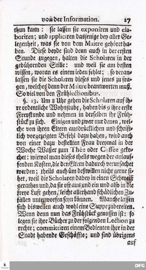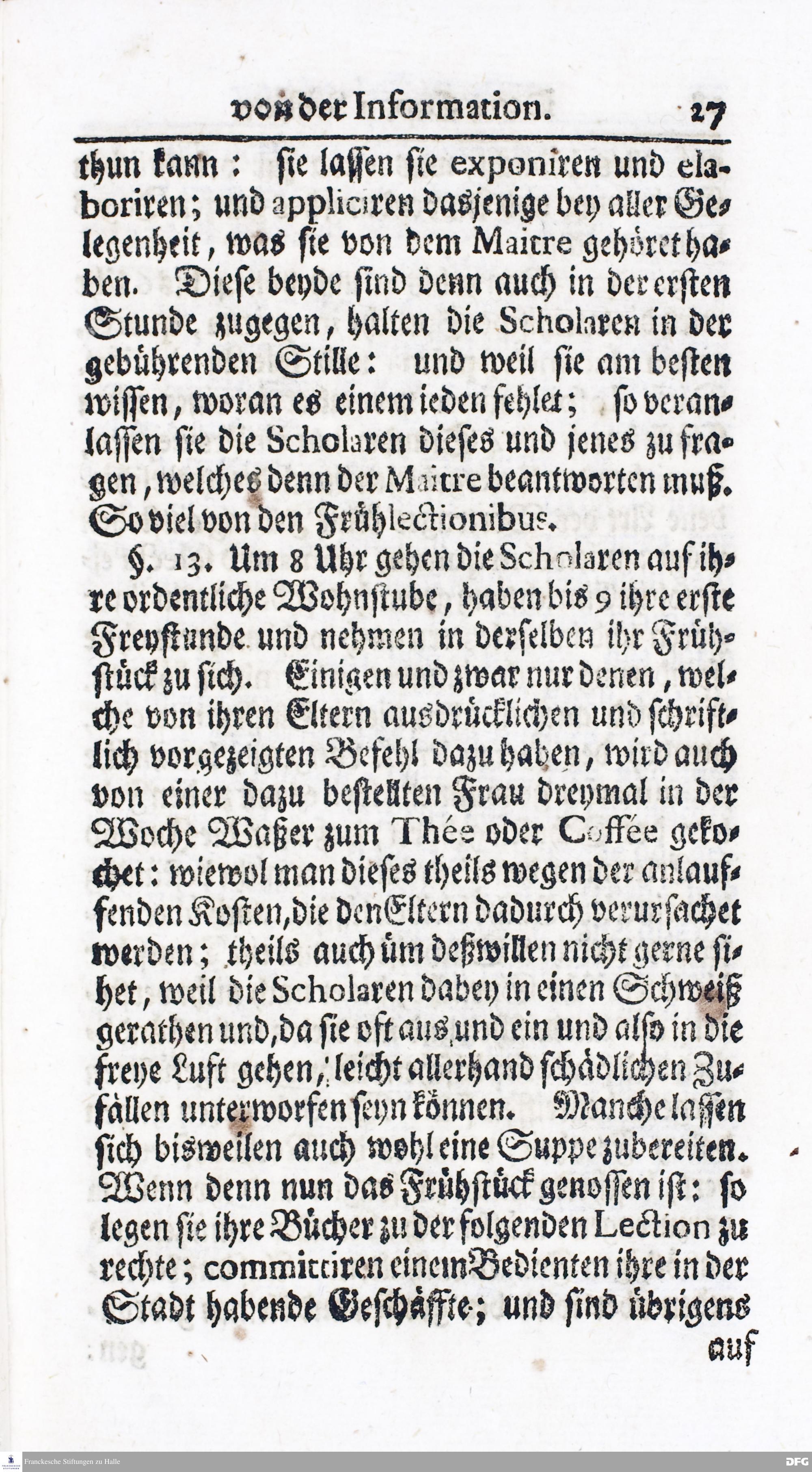 Kurzer Bericht Von der Gegenwärtigen Verfassung Des PAEDAGOGII REGII Zu Glaucha vor Halle / Aus der vormals schon edirten, nunmehro aber in vielen Stücken nach und nach verbesserten Ordnung und Lehrart herausgezogen. HALLE, Zu finden im Wäisenhause, MDCCXIV.