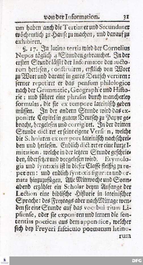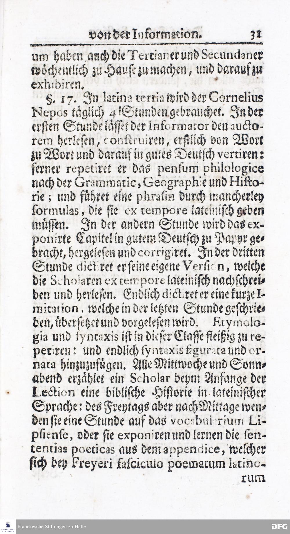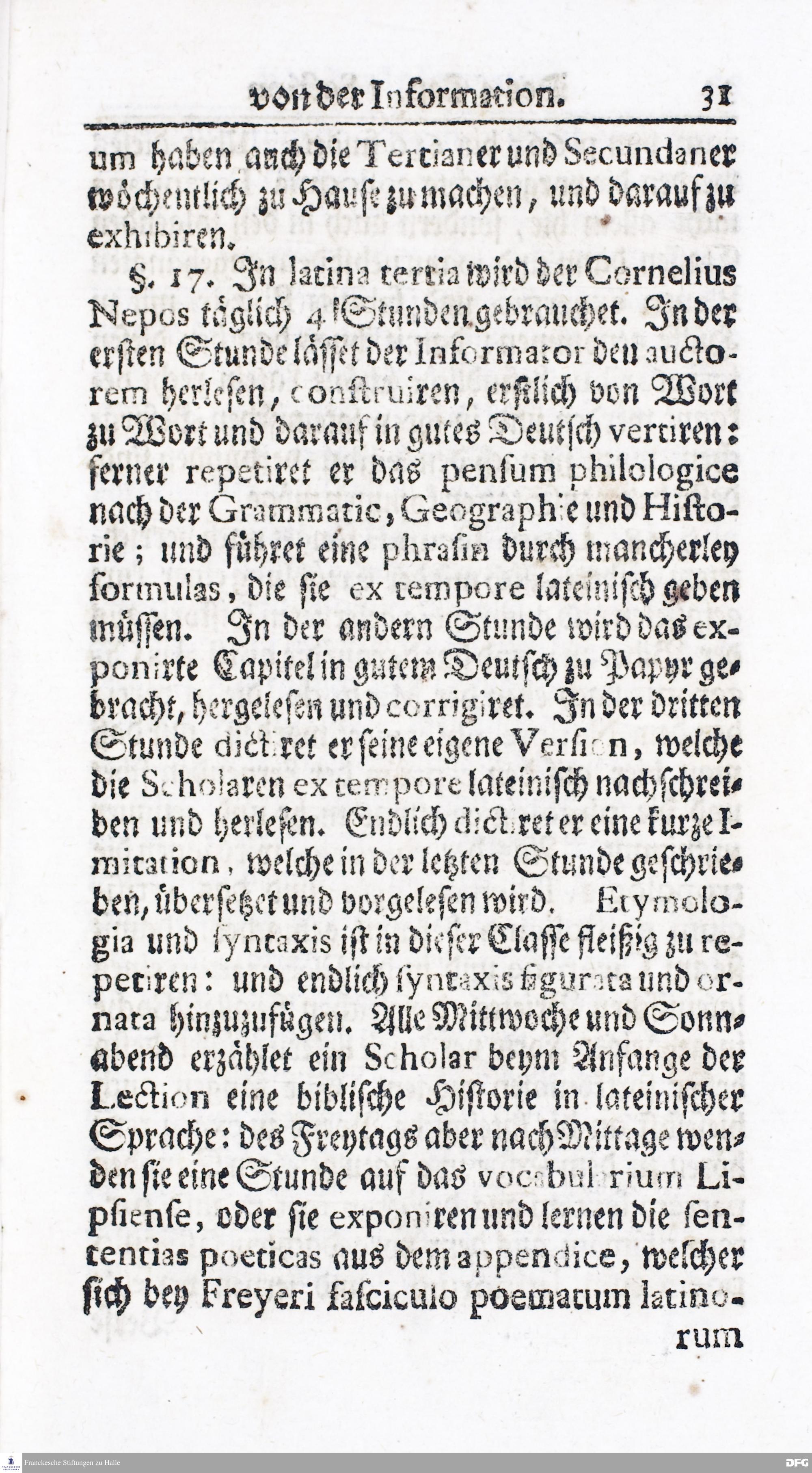 Kurzer Bericht Von der Gegenwärtigen Verfassung Des PAEDAGOGII REGII Zu Glaucha vor Halle / Aus der vormals schon edirten, nunmehro aber in vielen Stücken nach und nach verbesserten Ordnung und Lehrart herausgezogen. HALLE, Zu finden im Wäisenhause, MDCCXIV.