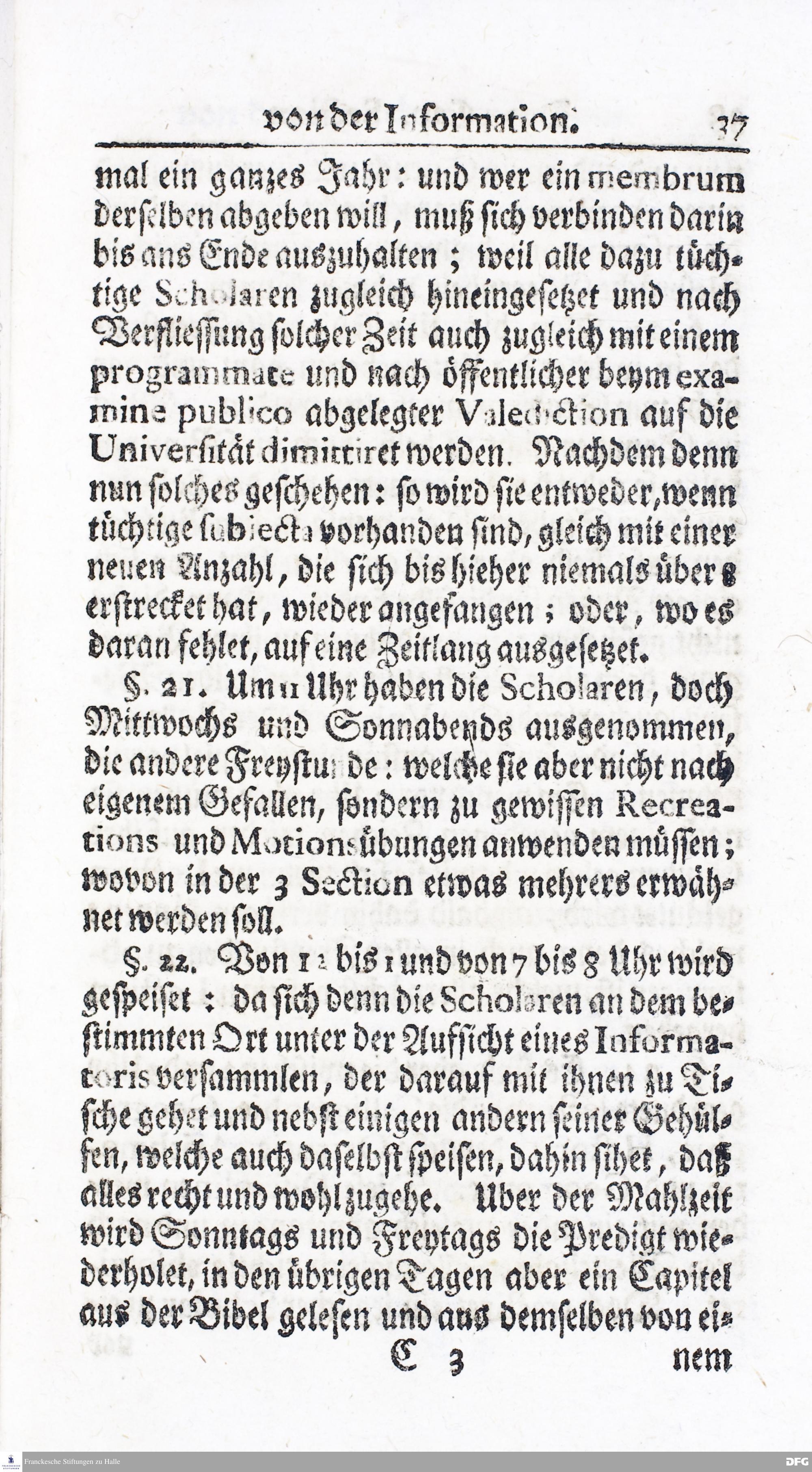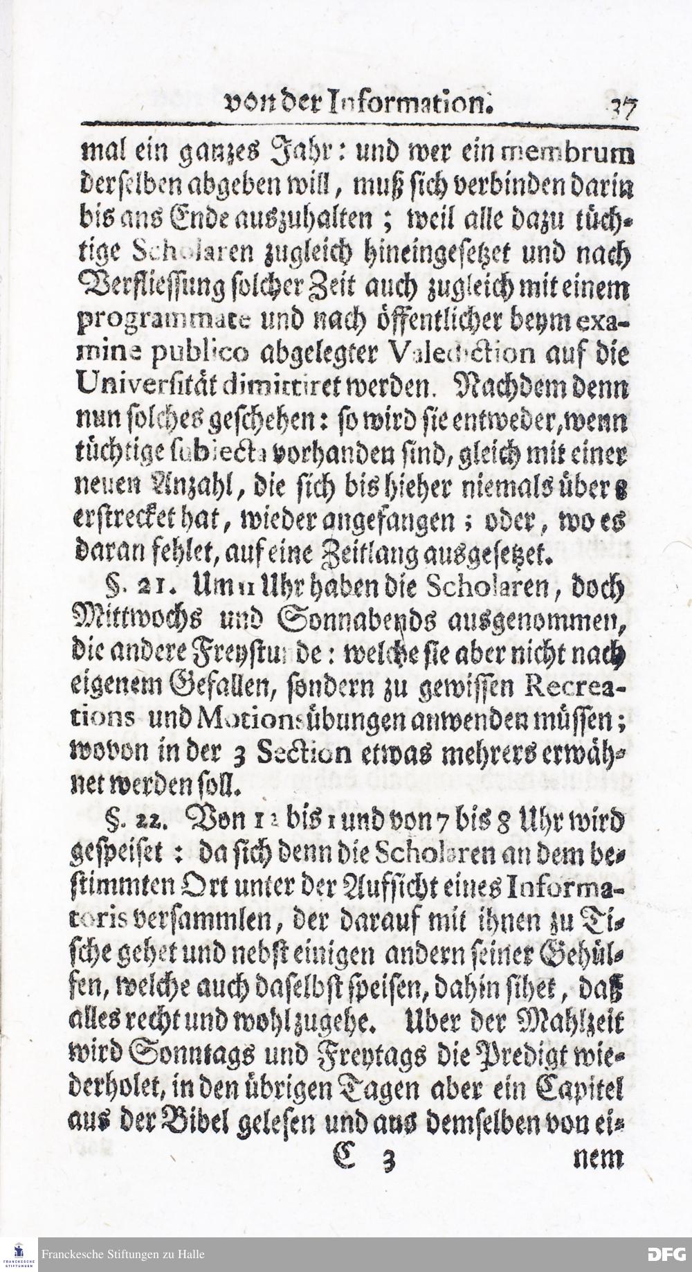 Kurzer Bericht Von der Gegenwärtigen Verfassung Des PAEDAGOGII REGII Zu Glaucha vor Halle / Aus der vormals schon edirten, nunmehro aber in vielen Stücken nach und nach verbesserten Ordnung und Lehrart herausgezogen. HALLE, Zu finden im Wäisenhause, MDCCXIV.