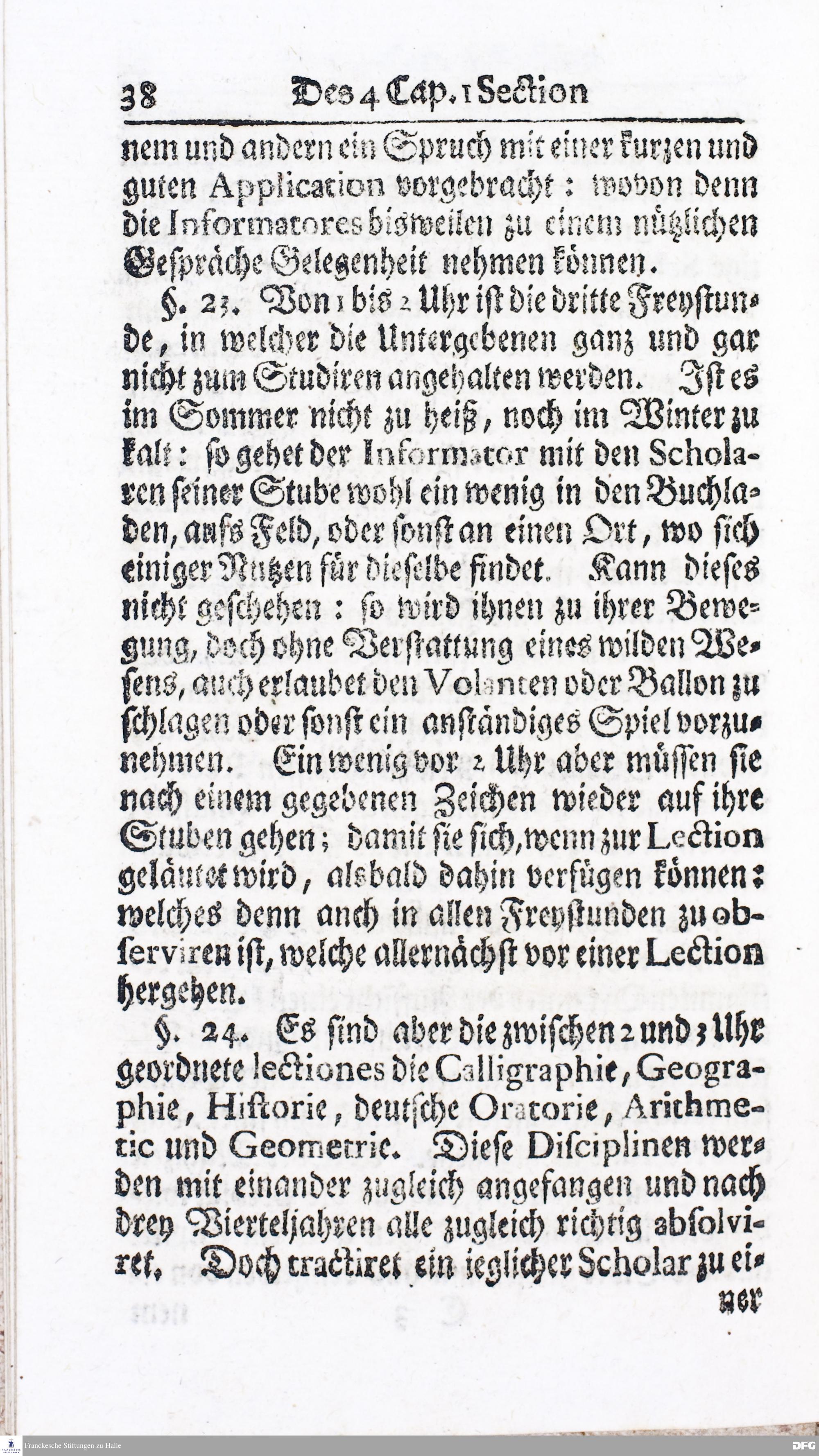 Kurzer Bericht Von der Gegenwärtigen Verfassung Des PAEDAGOGII REGII Zu Glaucha vor Halle / Aus der vormals schon edirten, nunmehro aber in vielen Stücken nach und nach verbesserten Ordnung und Lehrart herausgezogen. HALLE, Zu finden im Wäisenhause, MDCCXIV.