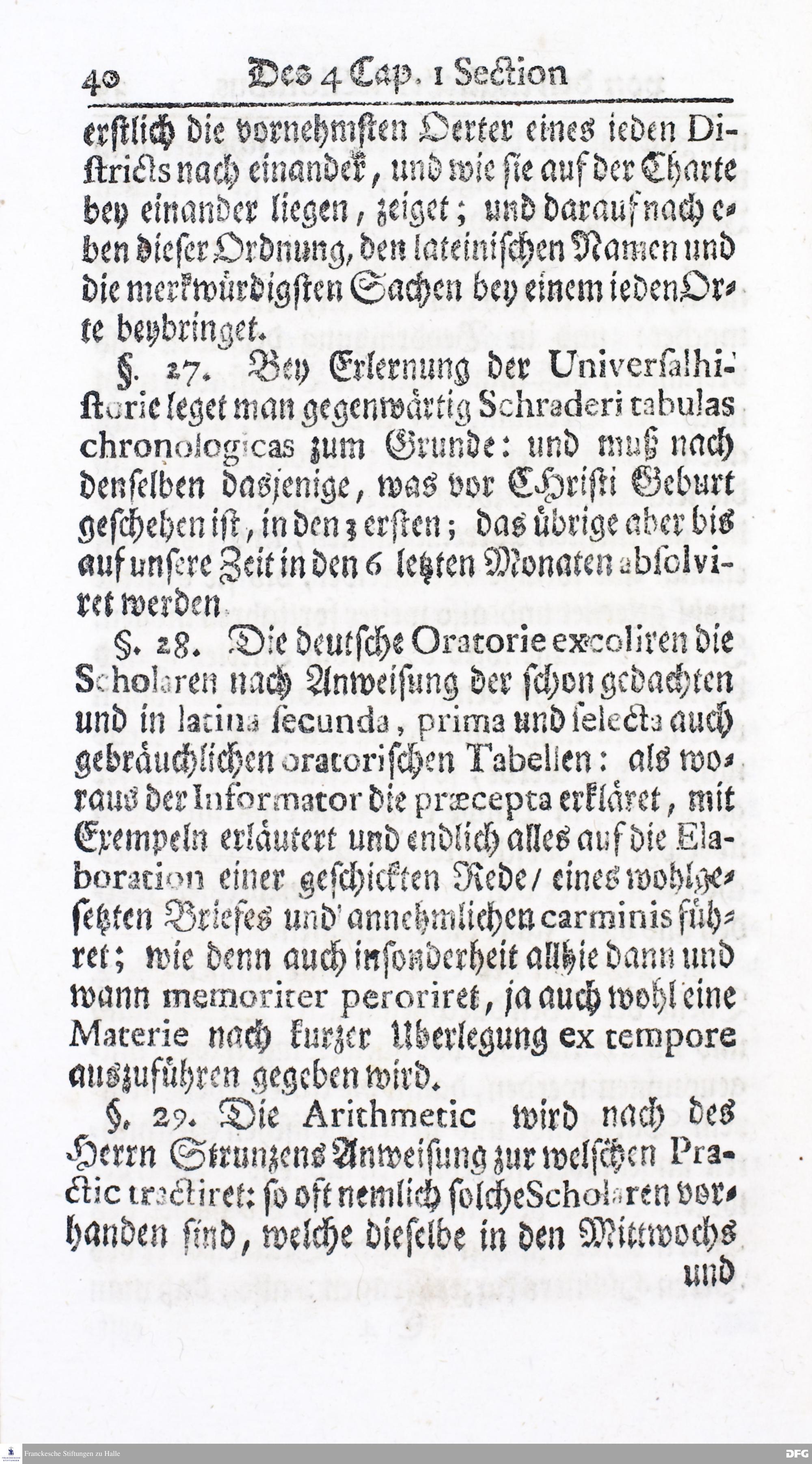 Kurzer Bericht Von der Gegenwärtigen Verfassung Des PAEDAGOGII REGII Zu Glaucha vor Halle / Aus der vormals schon edirten, nunmehro aber in vielen Stücken nach und nach verbesserten Ordnung und Lehrart herausgezogen. HALLE, Zu finden im Wäisenhause, MDCCXIV.