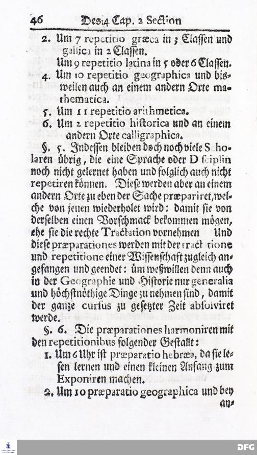 Kurzer Bericht Von der Gegenwärtigen Verfassung Des PAEDAGOGII REGII Zu Glaucha vor Halle / Aus der vormals schon edirten, nunmehro aber in vielen Stücken nach und nach verbesserten Ordnung und Lehrart herausgezogen. HALLE, Zu finden im Wäisenhause, MDCCXIV.