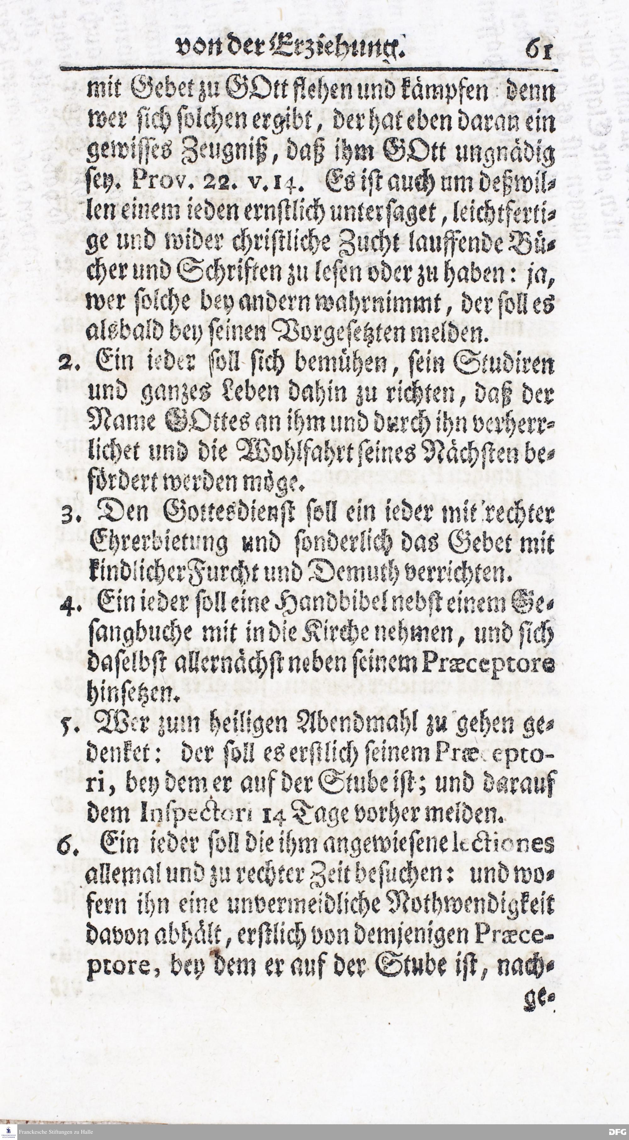 Kurzer Bericht Von der Gegenwärtigen Verfassung Des PAEDAGOGII REGII Zu Glaucha vor Halle / Aus der vormals schon edirten, nunmehro aber in vielen Stücken nach und nach verbesserten Ordnung und Lehrart herausgezogen. HALLE, Zu finden im Wäisenhause, MDCCXIV.