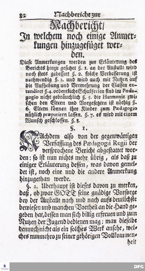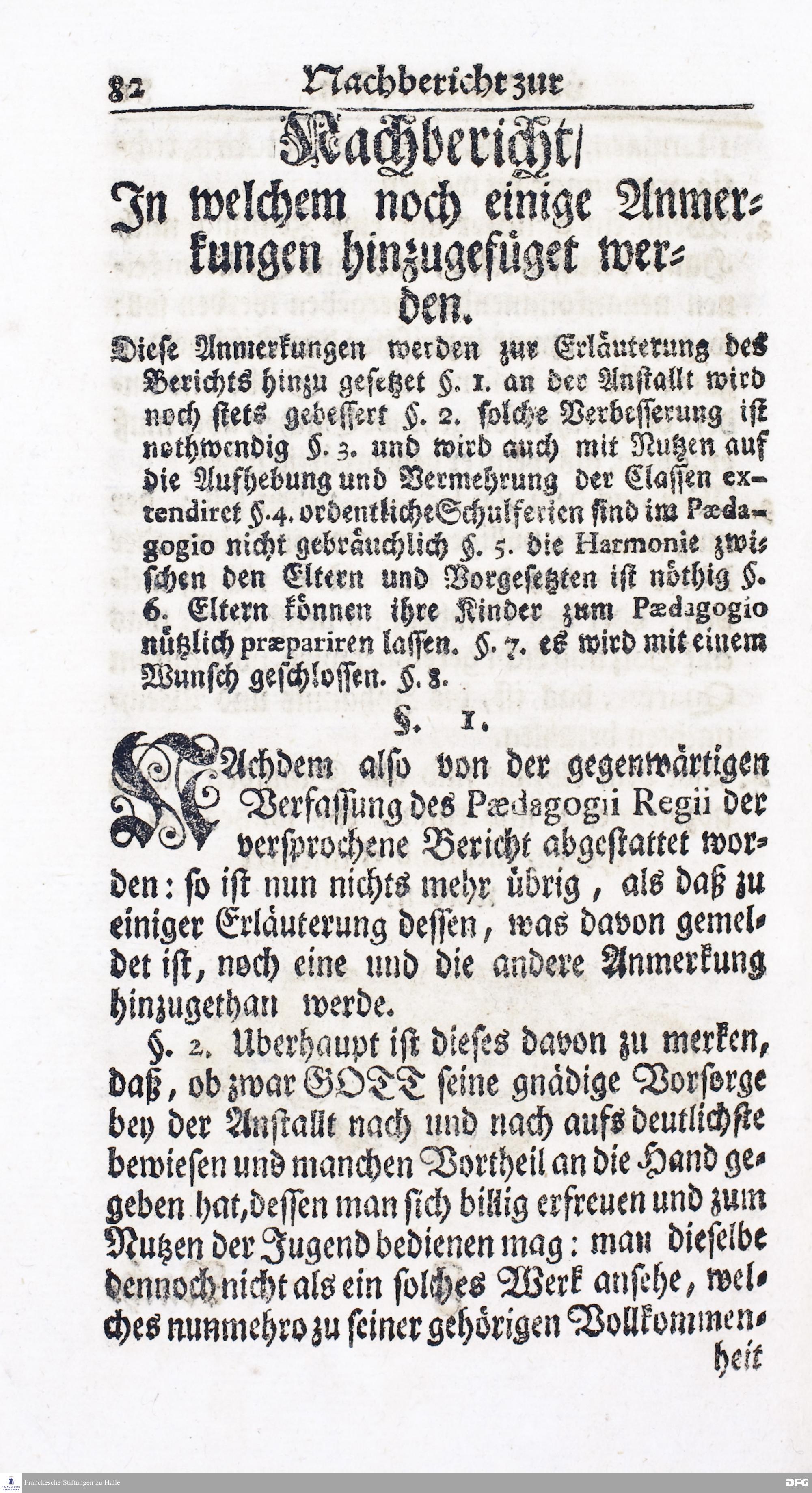 Kurzer Bericht Von der Gegenwärtigen Verfassung Des PAEDAGOGII REGII Zu Glaucha vor Halle / Aus der vormals schon edirten, nunmehro aber in vielen Stücken nach und nach verbesserten Ordnung und Lehrart herausgezogen. HALLE, Zu finden im Wäisenhause, MDCCXIV.