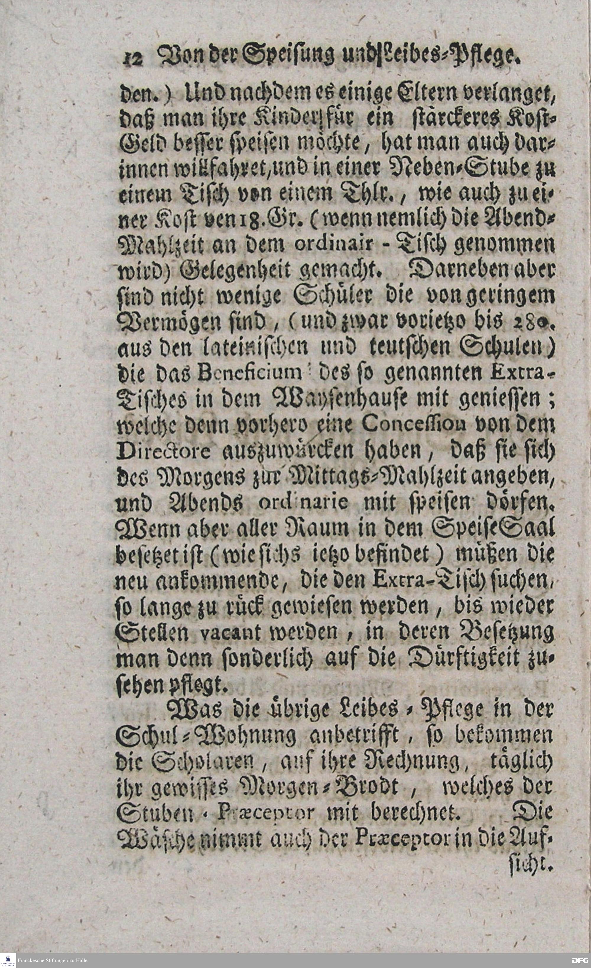 Kurtzer Bericht von der Gegenwärtigen Einrichtung Und Beschaffenheit Der Lateinischen Schule des Waysenhauses zu Glaucha an Halle, samt angehängten Nöthigen Erinnerungen An die lieben Eltern der Scholaren; Wie auch Eine Summarische Anzeige Der zur jährlichen Unterhaltung erforderlichen Kosten: Zum Dienst derer, Welche Nachfrage zu thun pflegen, im Druck vorgeleget Von dem Directore der gesammten Anstalten August Hermann Francken, SS.Theol.P.P.Ord.Past.Vlric. und Scholarcha. HALLE / zu finden im Waysenhause. MDCCXX.