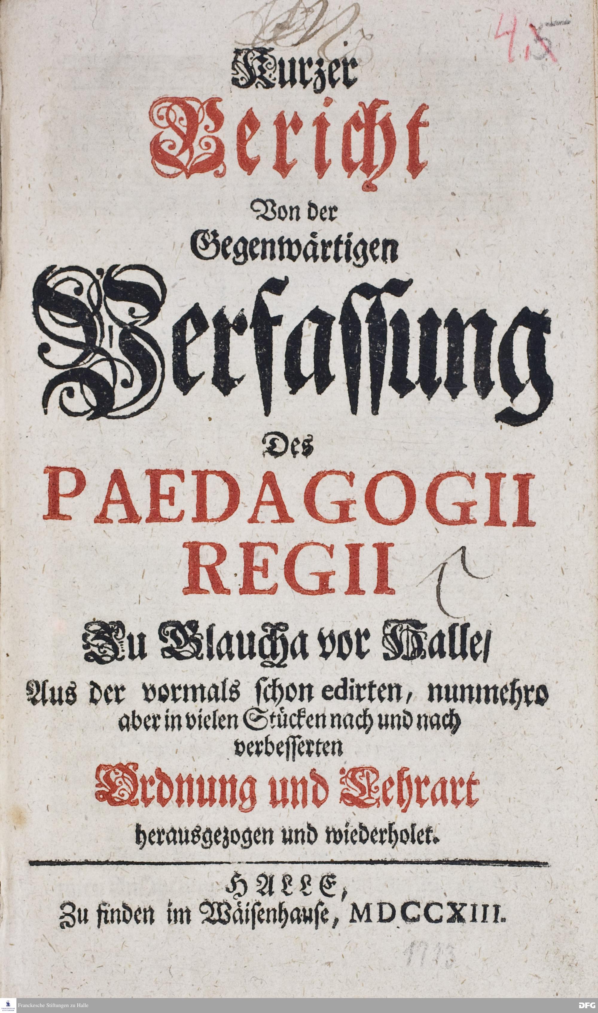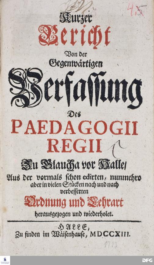 Kurzer Bericht Von der Gegenwärtigen Verfassung Des PAEDAGOGII REGII Zu Glaucha vor Halle / Aus der vormals schon edirten, nunmehro aber in vielen Stücken nach und nach verbesserten Ordnung und Lehrart herausgezogen und wiederholet. HALLE, Zu finden im Wäisenhause, MDCCXIII.