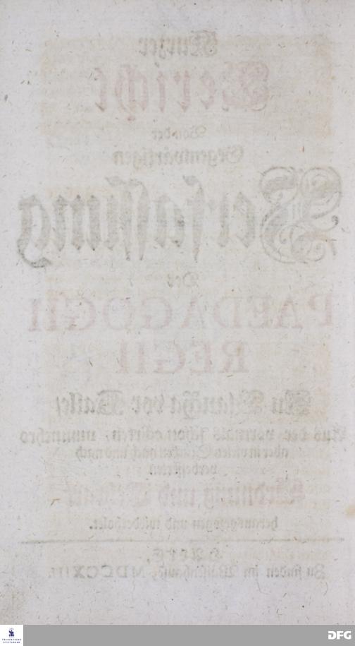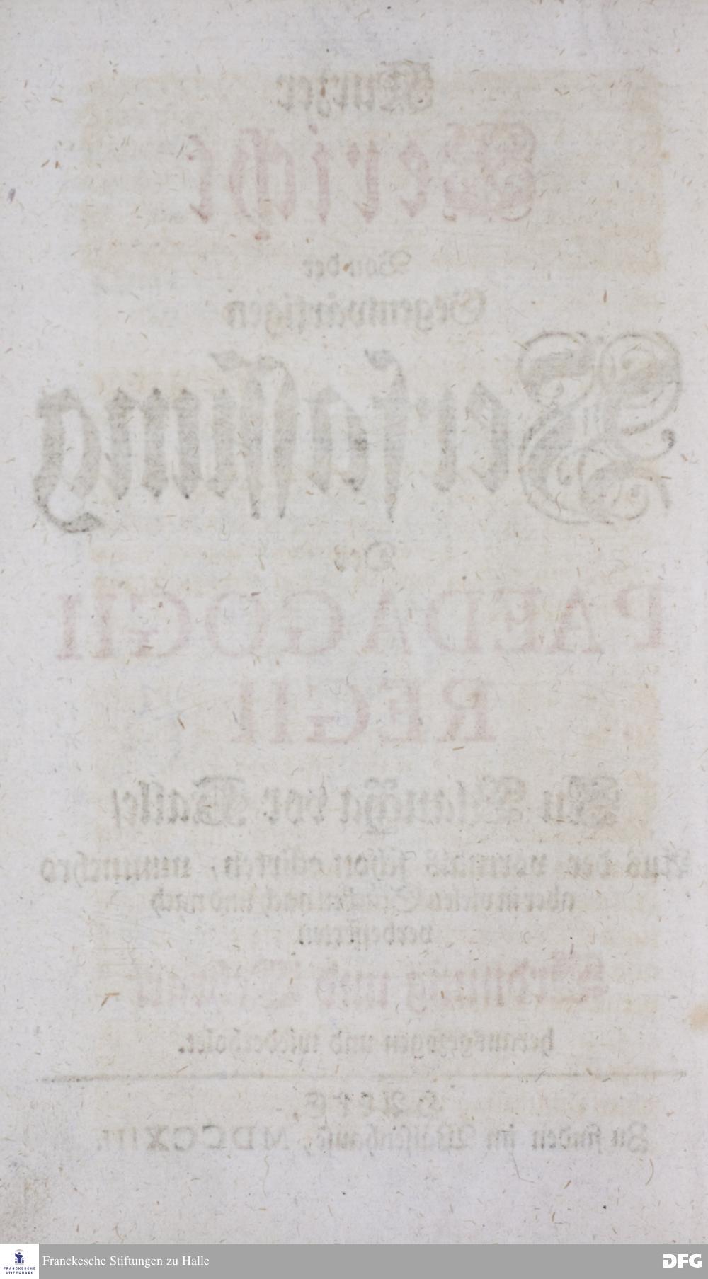 Kurzer Bericht Von der Gegenwärtigen Verfassung Des PAEDAGOGII REGII Zu Glaucha vor Halle / Aus der vormals schon edirten, nunmehro aber in vielen Stücken nach und nach verbesserten Ordnung und Lehrart herausgezogen und wiederholet. HALLE, Zu finden im Wäisenhause, MDCCXIII.