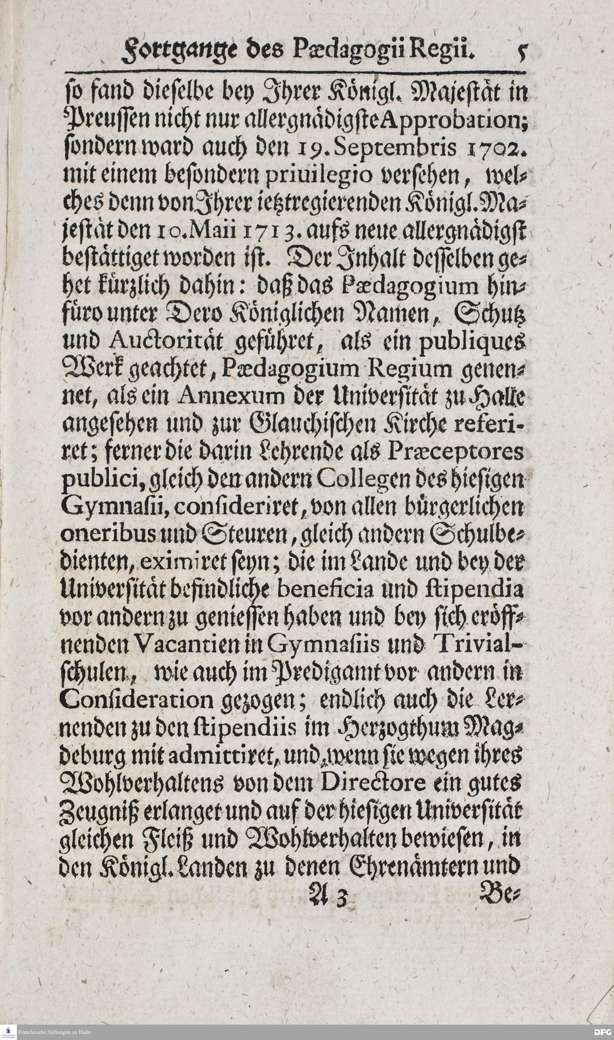 Kurzer Bericht Von der Gegenwärtigen Verfassung Des PAEDAGOGII REGII Zu Glaucha vor Halle / Aus der vormals schon edirten, nunmehro aber in vielen Stücken nach und nach verbesserten Ordnung und Lehrart herausgezogen und wiederholet. HALLE, Zu finden im Wäisenhause, MDCCXIII.