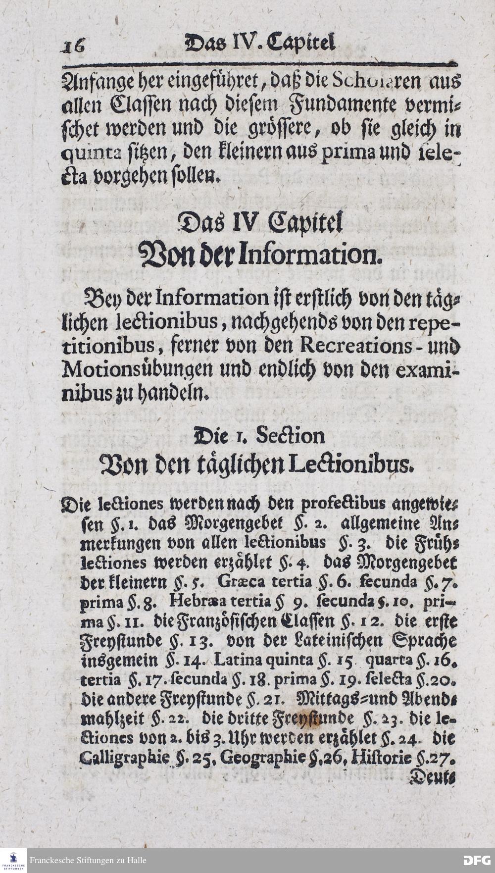 Kurzer Bericht Von der Gegenwärtigen Verfassung Des PAEDAGOGII REGII Zu Glaucha vor Halle / Aus der vormals schon edirten, nunmehro aber in vielen Stücken nach und nach verbesserten Ordnung und Lehrart herausgezogen und wiederholet. HALLE, Zu finden im Wäisenhause, MDCCXIII.