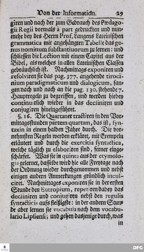 Kurzer Bericht Von der Gegenwärtigen Verfassung Des PAEDAGOGII REGII Zu Glaucha vor Halle / Aus der vormals schon edirten, nunmehro aber in vielen Stücken nach und nach verbesserten Ordnung und Lehrart herausgezogen und wiederholet. HALLE, Zu finden im Wäisenhause, MDCCXIII.