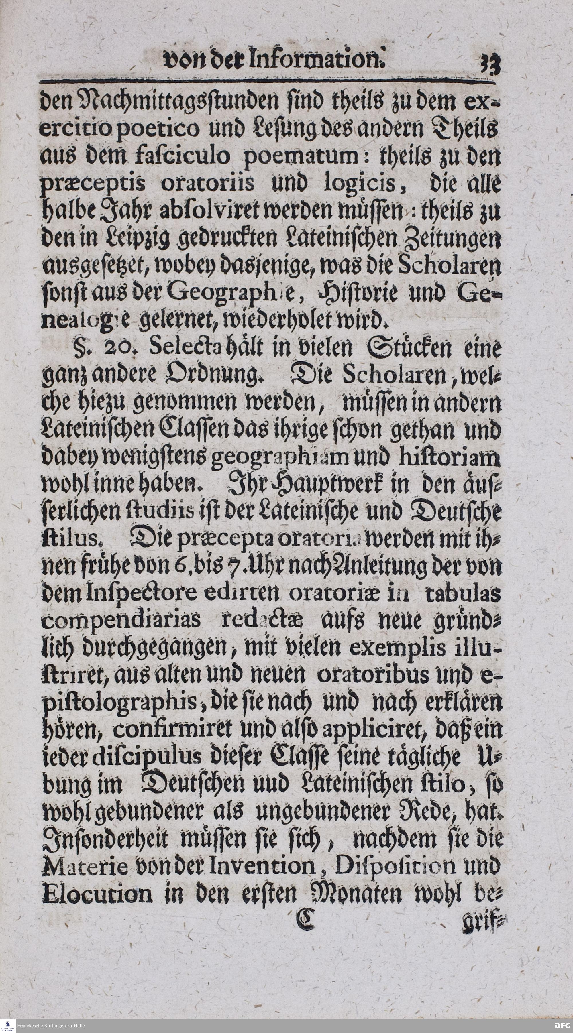 Kurzer Bericht Von der Gegenwärtigen Verfassung Des PAEDAGOGII REGII Zu Glaucha vor Halle / Aus der vormals schon edirten, nunmehro aber in vielen Stücken nach und nach verbesserten Ordnung und Lehrart herausgezogen und wiederholet. HALLE, Zu finden im Wäisenhause, MDCCXIII.