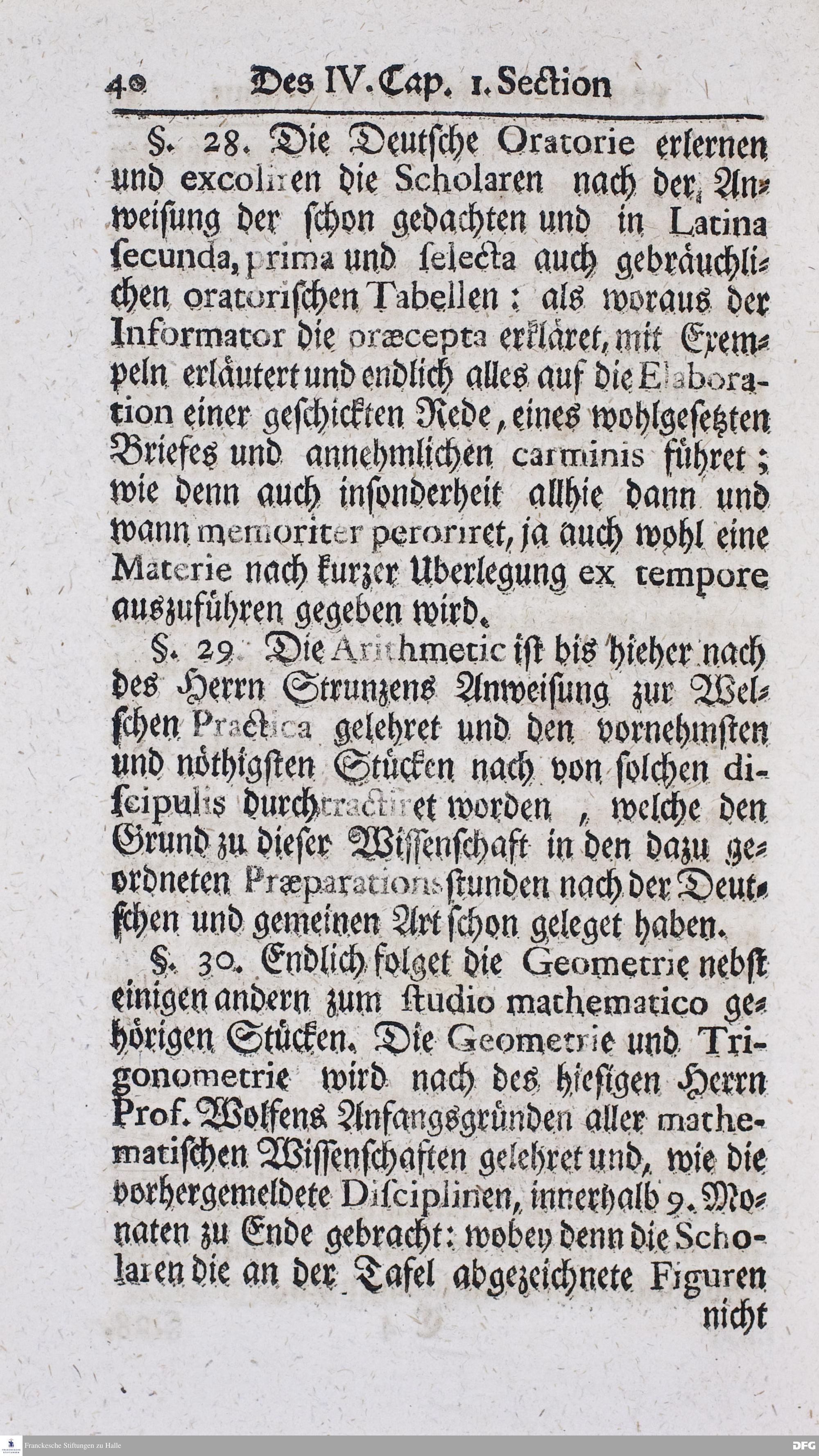 Kurzer Bericht Von der Gegenwärtigen Verfassung Des PAEDAGOGII REGII Zu Glaucha vor Halle / Aus der vormals schon edirten, nunmehro aber in vielen Stücken nach und nach verbesserten Ordnung und Lehrart herausgezogen und wiederholet. HALLE, Zu finden im Wäisenhause, MDCCXIII.