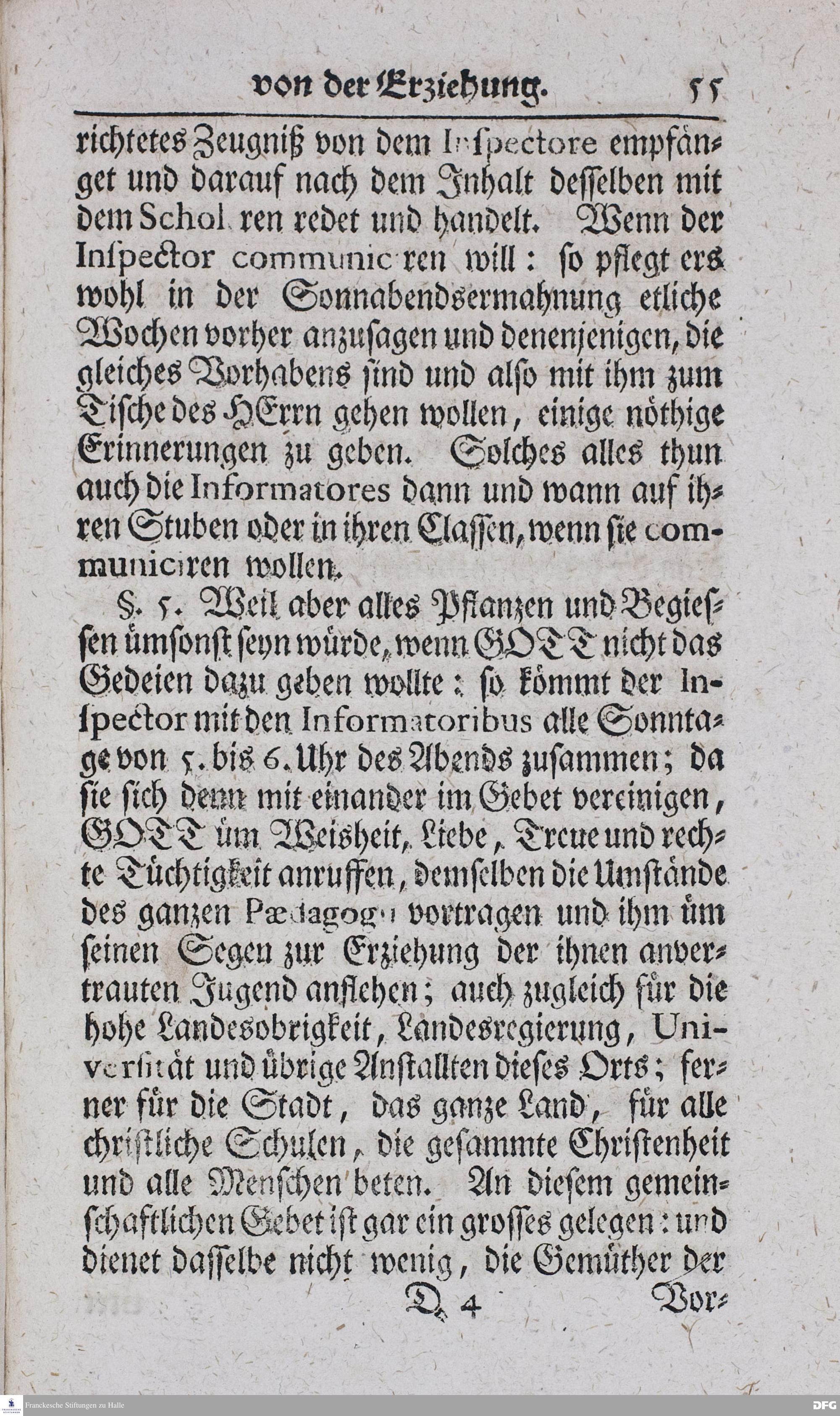 Kurzer Bericht Von der Gegenwärtigen Verfassung Des PAEDAGOGII REGII Zu Glaucha vor Halle / Aus der vormals schon edirten, nunmehro aber in vielen Stücken nach und nach verbesserten Ordnung und Lehrart herausgezogen und wiederholet. HALLE, Zu finden im Wäisenhause, MDCCXIII.
