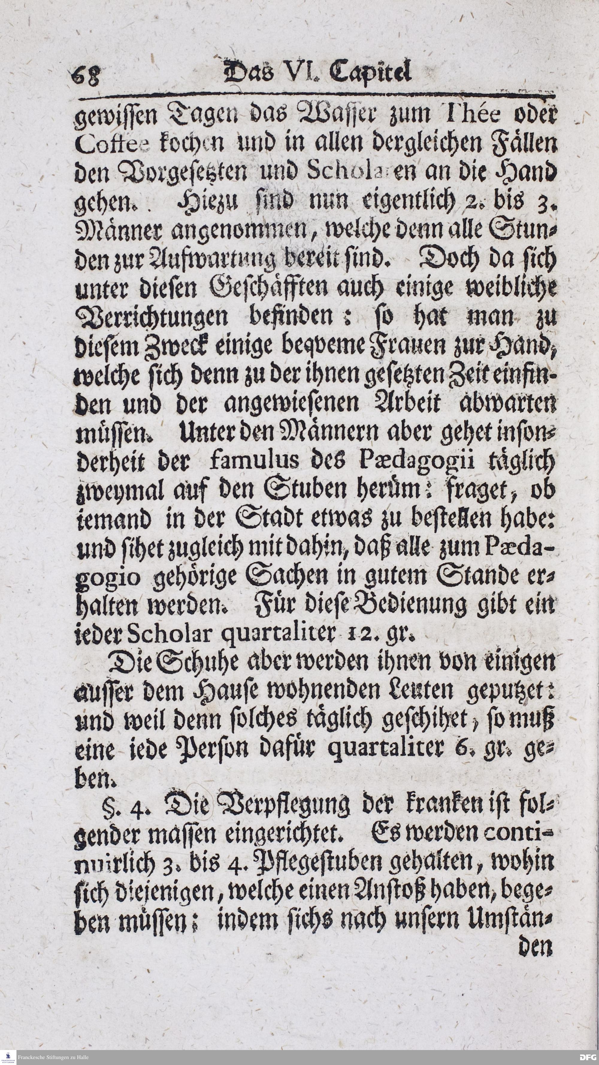 Kurzer Bericht Von der Gegenwärtigen Verfassung Des PAEDAGOGII REGII Zu Glaucha vor Halle / Aus der vormals schon edirten, nunmehro aber in vielen Stücken nach und nach verbesserten Ordnung und Lehrart herausgezogen und wiederholet. HALLE, Zu finden im Wäisenhause, MDCCXIII.
