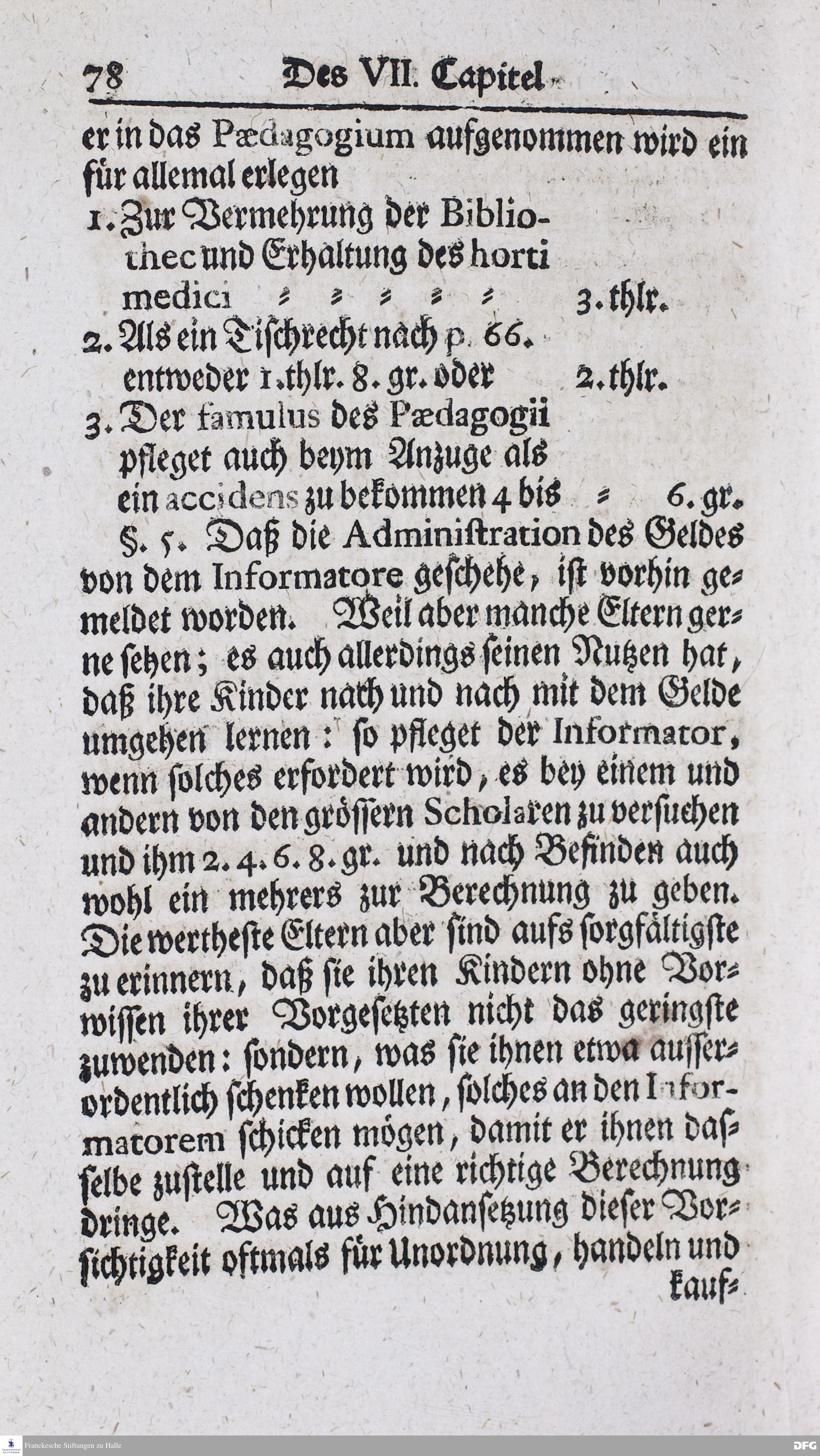 Kurzer Bericht Von der Gegenwärtigen Verfassung Des PAEDAGOGII REGII Zu Glaucha vor Halle / Aus der vormals schon edirten, nunmehro aber in vielen Stücken nach und nach verbesserten Ordnung und Lehrart herausgezogen und wiederholet. HALLE, Zu finden im Wäisenhause, MDCCXIII.