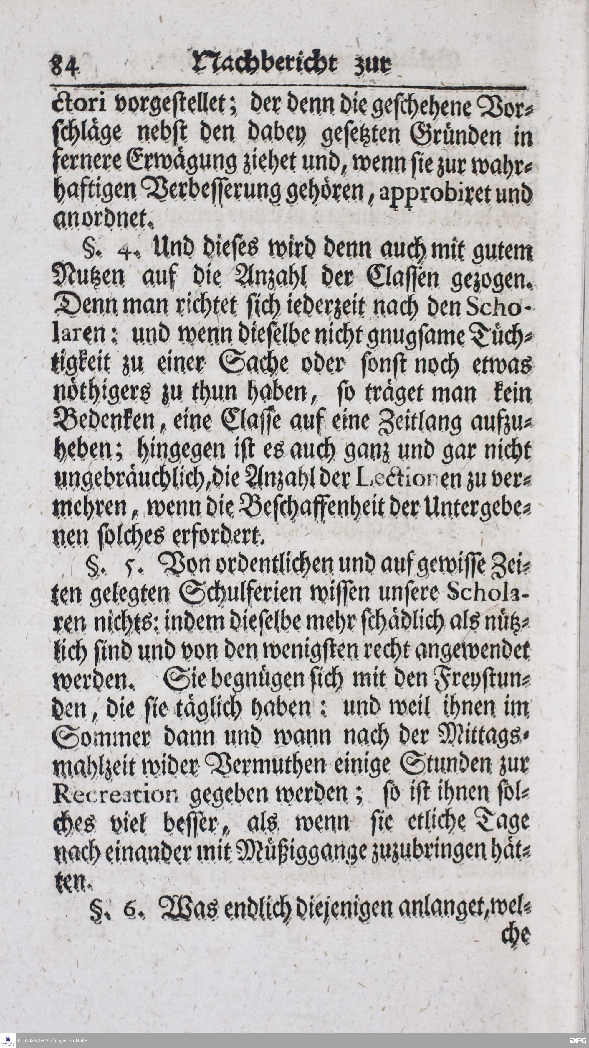 Kurzer Bericht Von der Gegenwärtigen Verfassung Des PAEDAGOGII REGII Zu Glaucha vor Halle / Aus der vormals schon edirten, nunmehro aber in vielen Stücken nach und nach verbesserten Ordnung und Lehrart herausgezogen und wiederholet. HALLE, Zu finden im Wäisenhause, MDCCXIII.