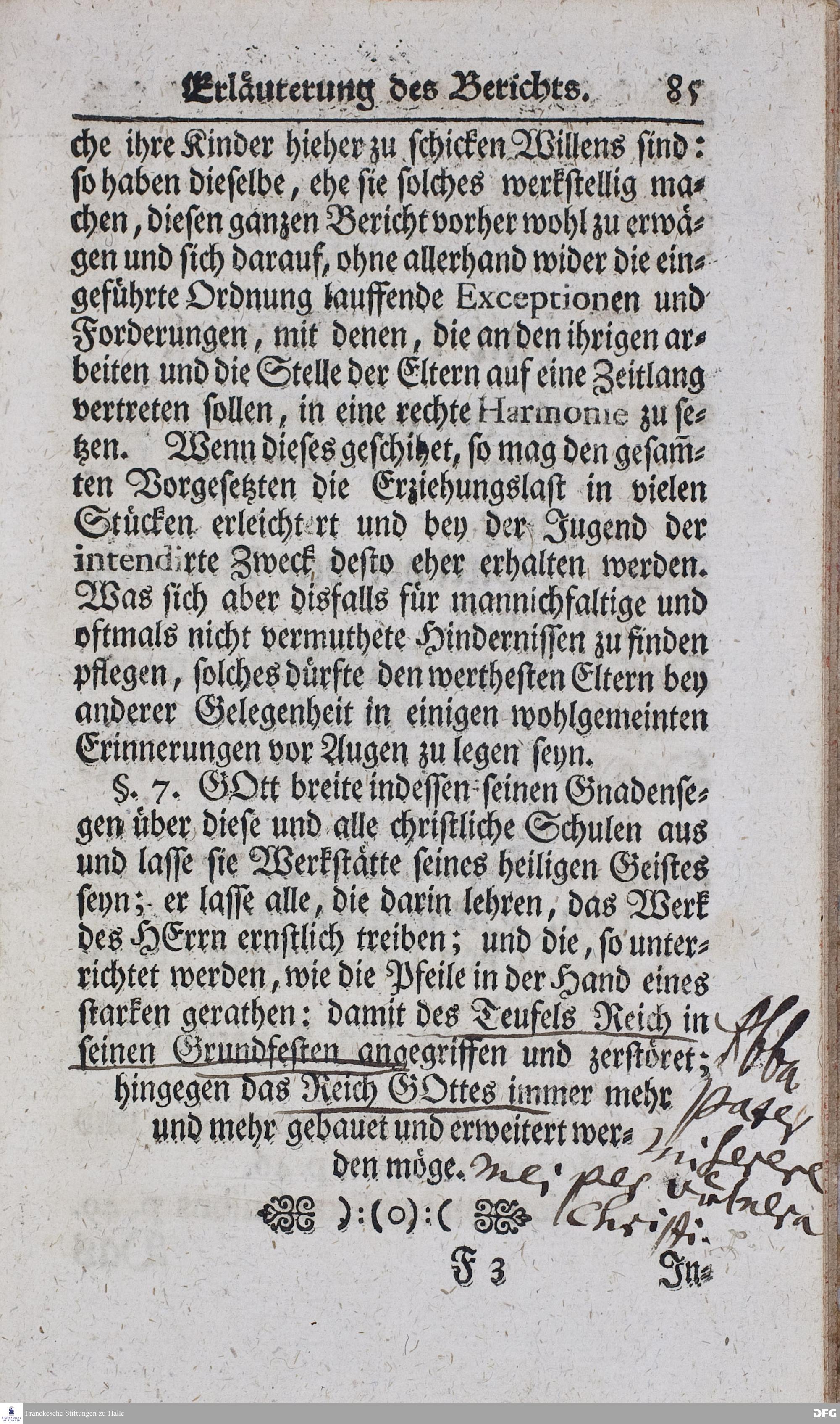 Kurzer Bericht Von der Gegenwärtigen Verfassung Des PAEDAGOGII REGII Zu Glaucha vor Halle / Aus der vormals schon edirten, nunmehro aber in vielen Stücken nach und nach verbesserten Ordnung und Lehrart herausgezogen und wiederholet. HALLE, Zu finden im Wäisenhause, MDCCXIII.