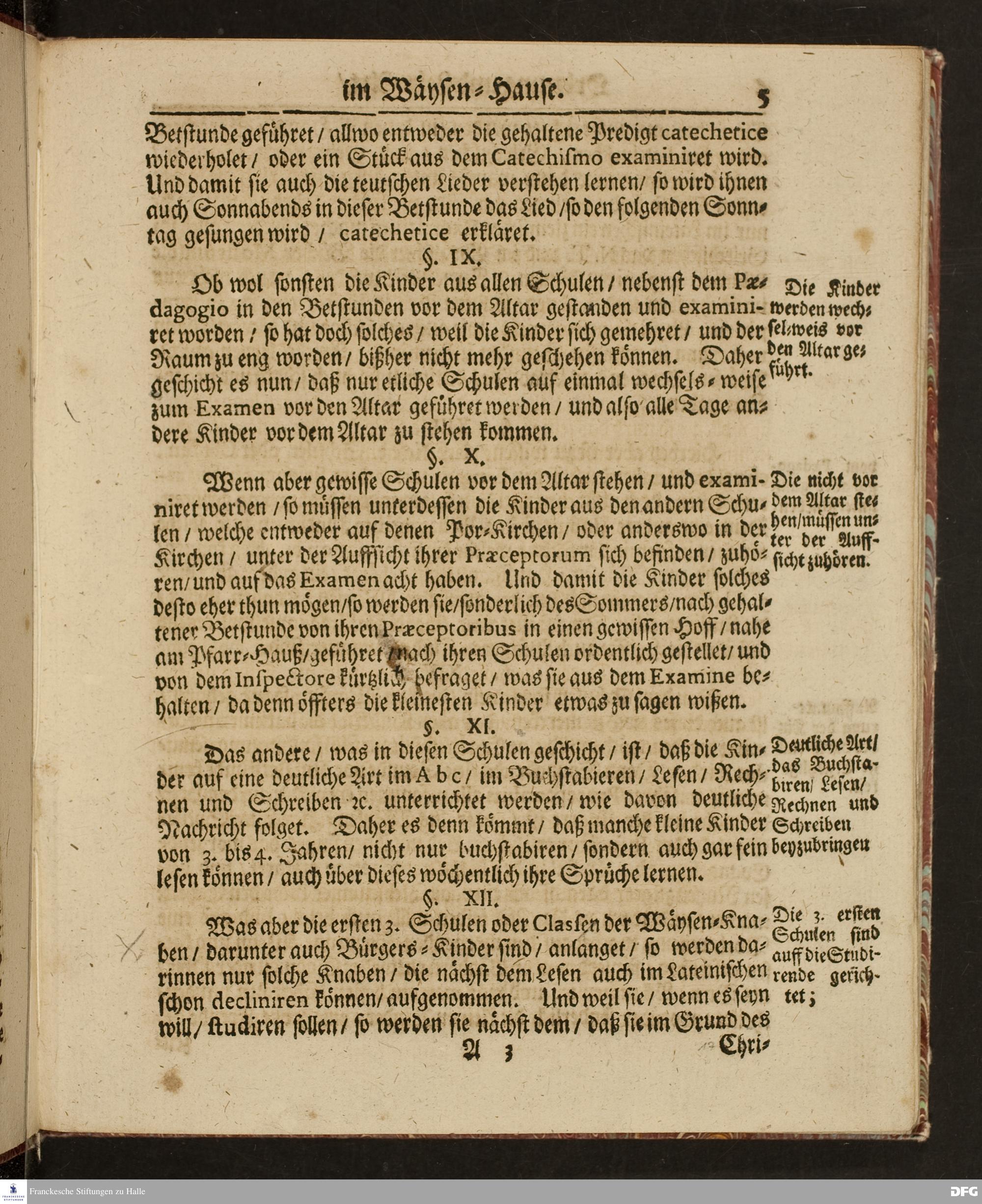 Ordnung und Lehr=Art / Wie selbige in denen zum Wäysen=Hause gehörigen Schulen eingeführet ist / Worinnen vornemlich zu befinden / Wie die Kinder in und ausser der Schul in Christlicher Zucht zu halten / und zum Lesen / zierlichen Schreiben / Rechnen / wie auch zur Music und andern nützlichen Dingen anzuführen sind / entworffen von August Hermann Francken / S.Theol.Prof.Ord.& Past. HALLE / Gedruckt im Wäysen=Hause / 1702.