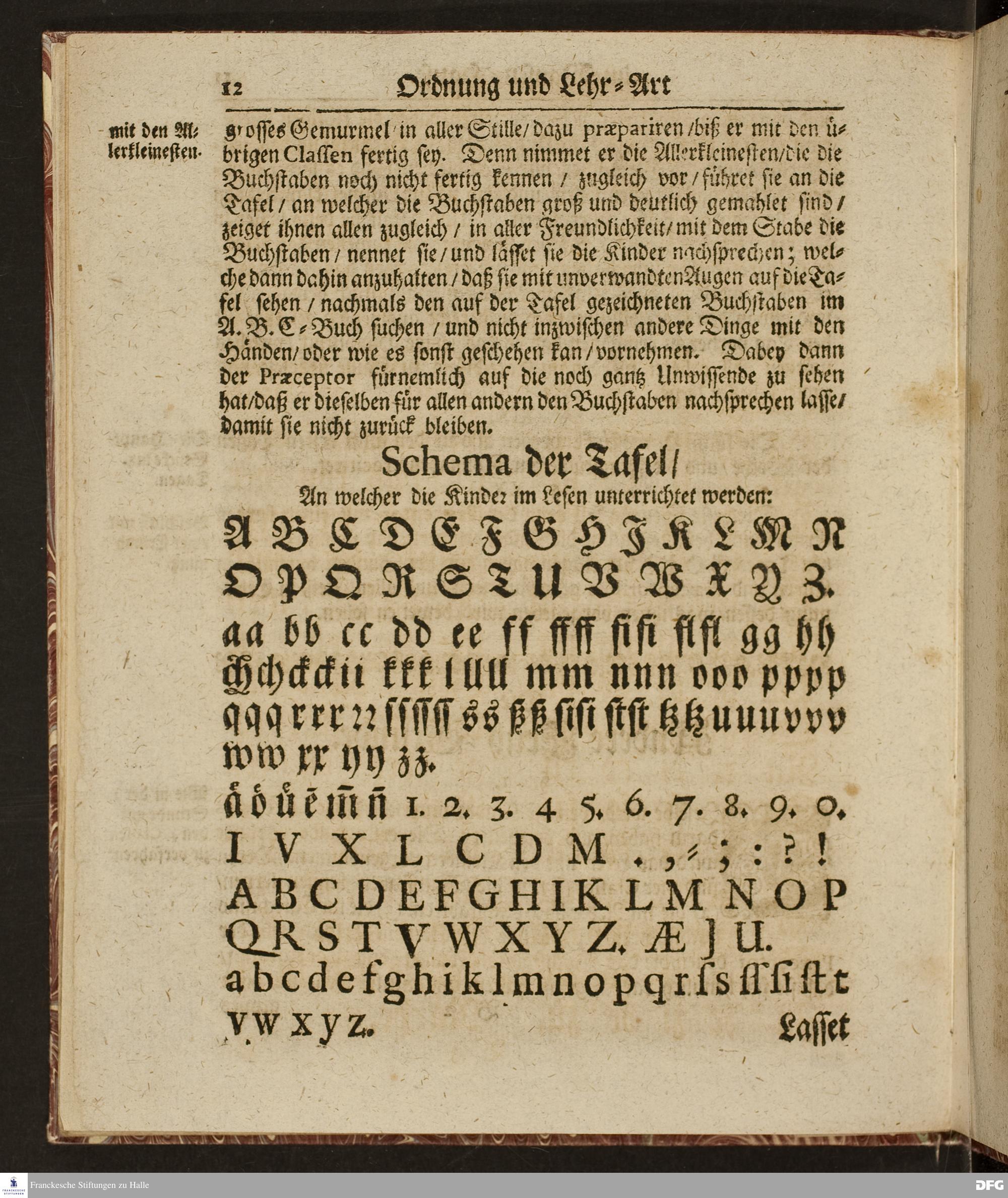 Ordnung und Lehr=Art / Wie selbige in denen zum Wäysen=Hause gehörigen Schulen eingeführet ist / Worinnen vornemlich zu befinden / Wie die Kinder in und ausser der Schul in Christlicher Zucht zu halten / und zum Lesen / zierlichen Schreiben / Rechnen / wie auch zur Music und andern nützlichen Dingen anzuführen sind / entworffen von August Hermann Francken / S.Theol.Prof.Ord.& Past. HALLE / Gedruckt im Wäysen=Hause / 1702.