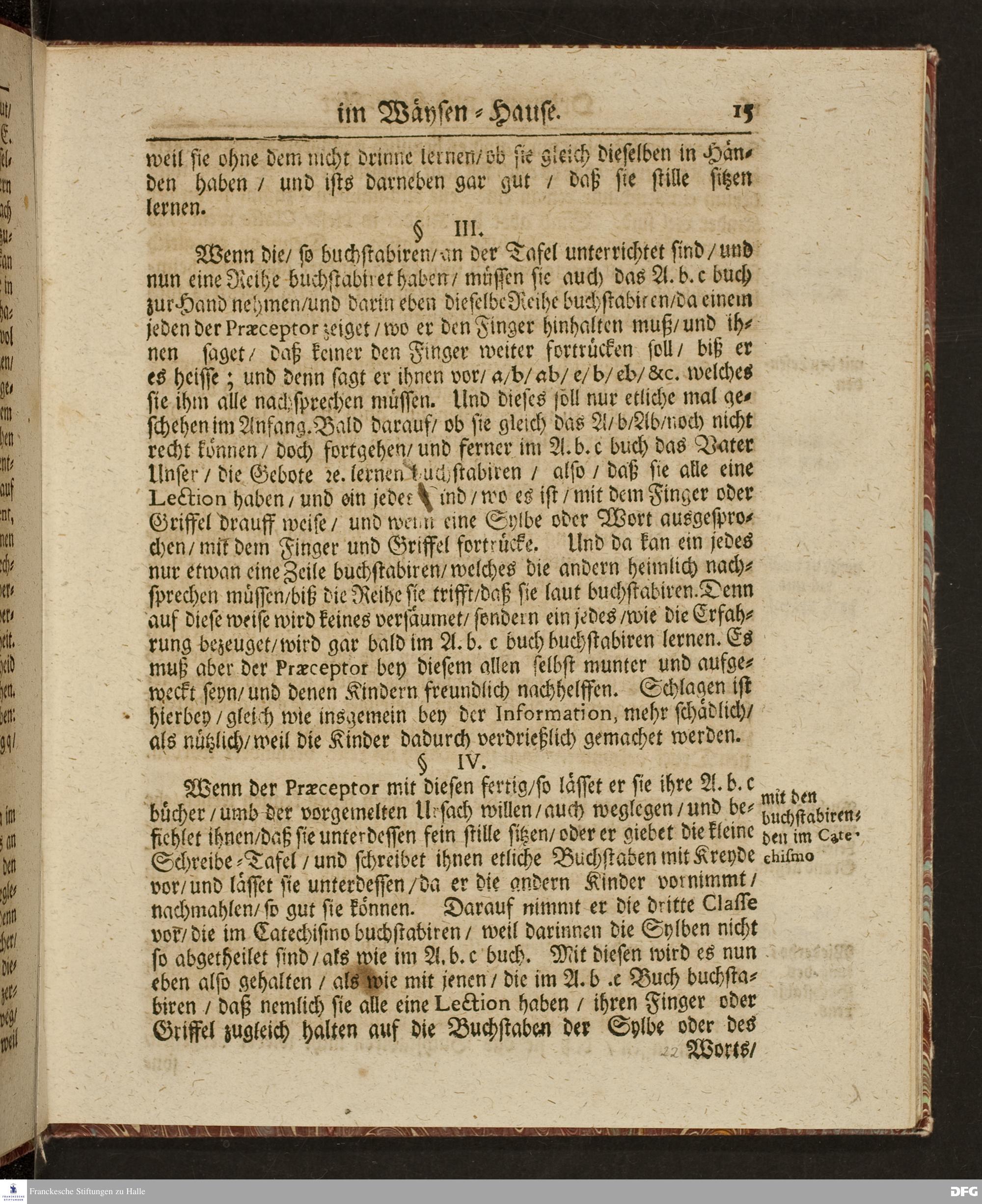 Ordnung und Lehr=Art / Wie selbige in denen zum Wäysen=Hause gehörigen Schulen eingeführet ist / Worinnen vornemlich zu befinden / Wie die Kinder in und ausser der Schul in Christlicher Zucht zu halten / und zum Lesen / zierlichen Schreiben / Rechnen / wie auch zur Music und andern nützlichen Dingen anzuführen sind / entworffen von August Hermann Francken / S.Theol.Prof.Ord.& Past. HALLE / Gedruckt im Wäysen=Hause / 1702.
