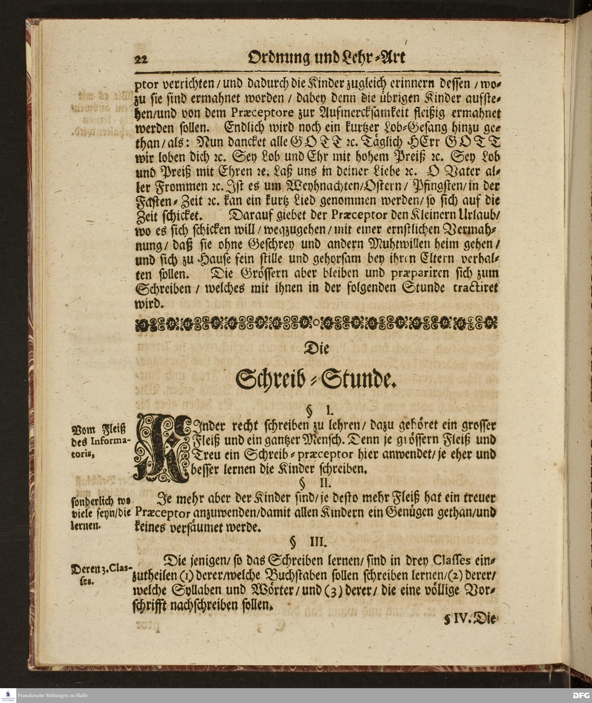 Ordnung und Lehr=Art / Wie selbige in denen zum Wäysen=Hause gehörigen Schulen eingeführet ist / Worinnen vornemlich zu befinden / Wie die Kinder in und ausser der Schul in Christlicher Zucht zu halten / und zum Lesen / zierlichen Schreiben / Rechnen / wie auch zur Music und andern nützlichen Dingen anzuführen sind / entworffen von August Hermann Francken / S.Theol.Prof.Ord.& Past. HALLE / Gedruckt im Wäysen=Hause / 1702.
