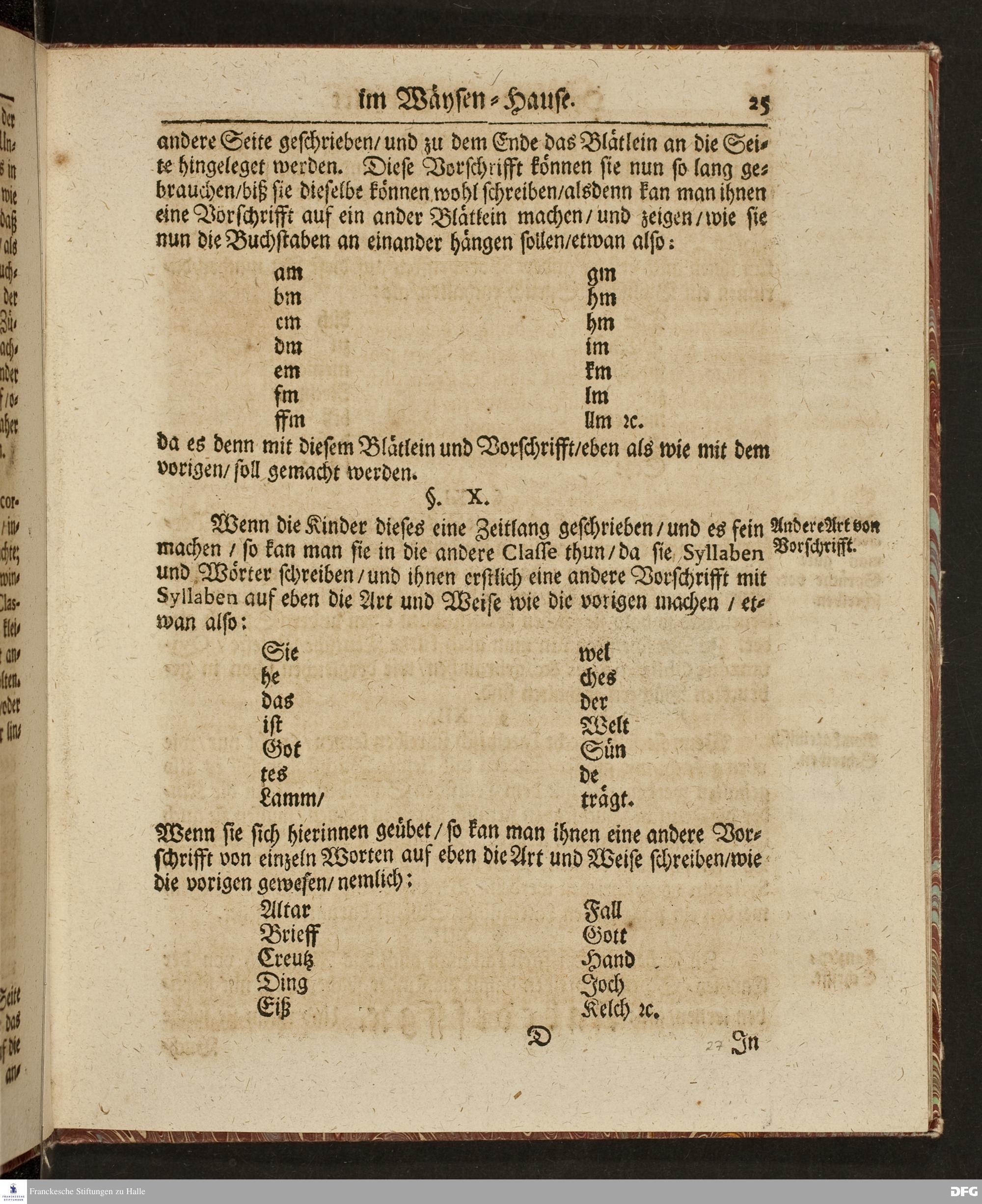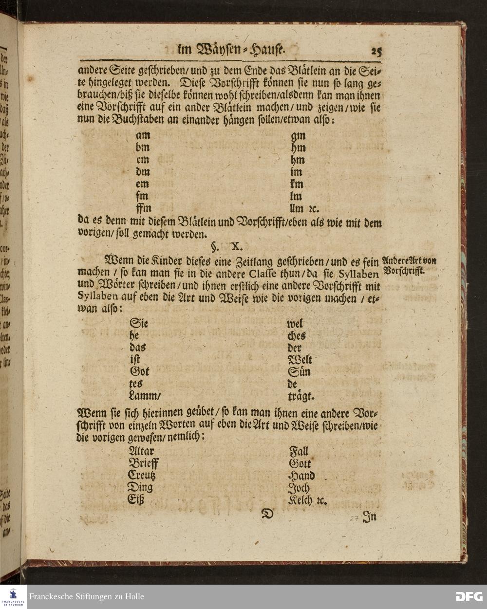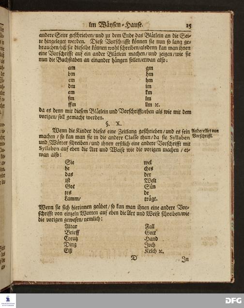 Ordnung und Lehr=Art / Wie selbige in denen zum Wäysen=Hause gehörigen Schulen eingeführet ist / Worinnen vornemlich zu befinden / Wie die Kinder in und ausser der Schul in Christlicher Zucht zu halten / und zum Lesen / zierlichen Schreiben / Rechnen / wie auch zur Music und andern nützlichen Dingen anzuführen sind / entworffen von August Hermann Francken / S.Theol.Prof.Ord.& Past. HALLE / Gedruckt im Wäysen=Hause / 1702.