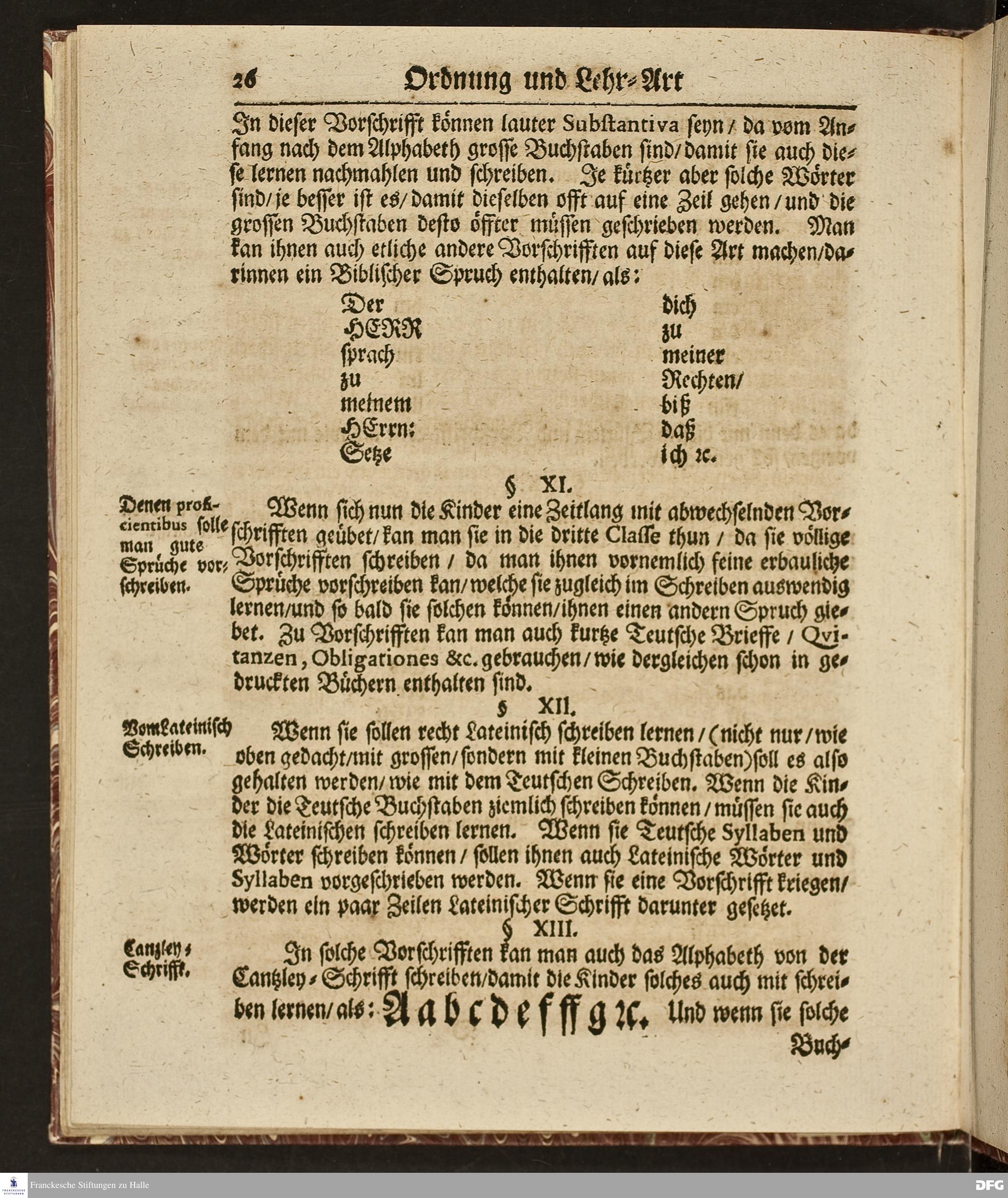 Ordnung und Lehr=Art / Wie selbige in denen zum Wäysen=Hause gehörigen Schulen eingeführet ist / Worinnen vornemlich zu befinden / Wie die Kinder in und ausser der Schul in Christlicher Zucht zu halten / und zum Lesen / zierlichen Schreiben / Rechnen / wie auch zur Music und andern nützlichen Dingen anzuführen sind / entworffen von August Hermann Francken / S.Theol.Prof.Ord.& Past. HALLE / Gedruckt im Wäysen=Hause / 1702.
