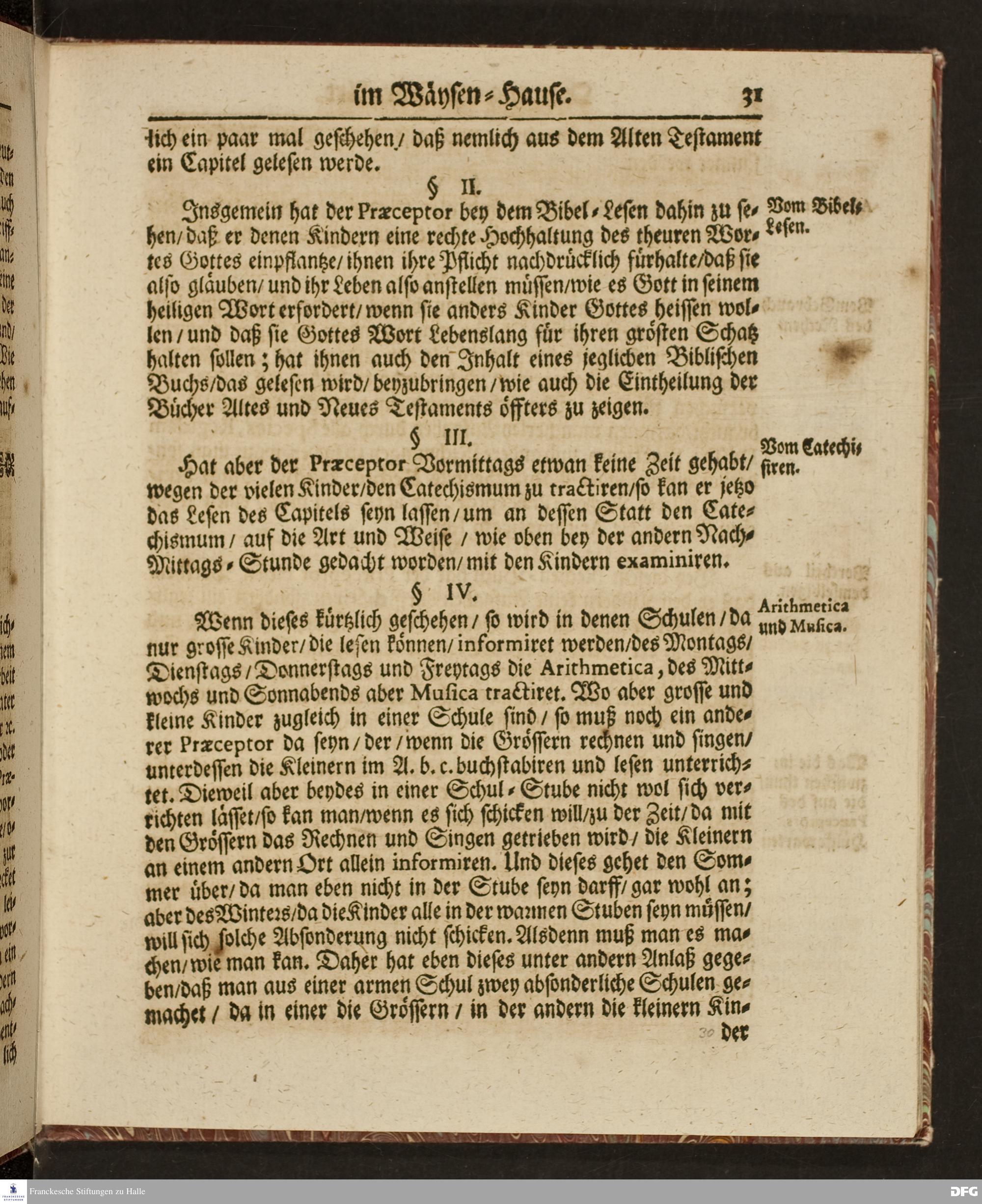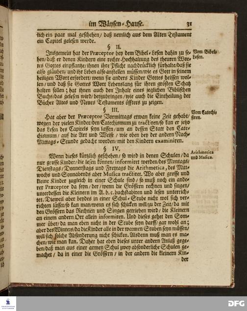 Ordnung und Lehr=Art / Wie selbige in denen zum Wäysen=Hause gehörigen Schulen eingeführet ist / Worinnen vornemlich zu befinden / Wie die Kinder in und ausser der Schul in Christlicher Zucht zu halten / und zum Lesen / zierlichen Schreiben / Rechnen / wie auch zur Music und andern nützlichen Dingen anzuführen sind / entworffen von August Hermann Francken / S.Theol.Prof.Ord.& Past. HALLE / Gedruckt im Wäysen=Hause / 1702.