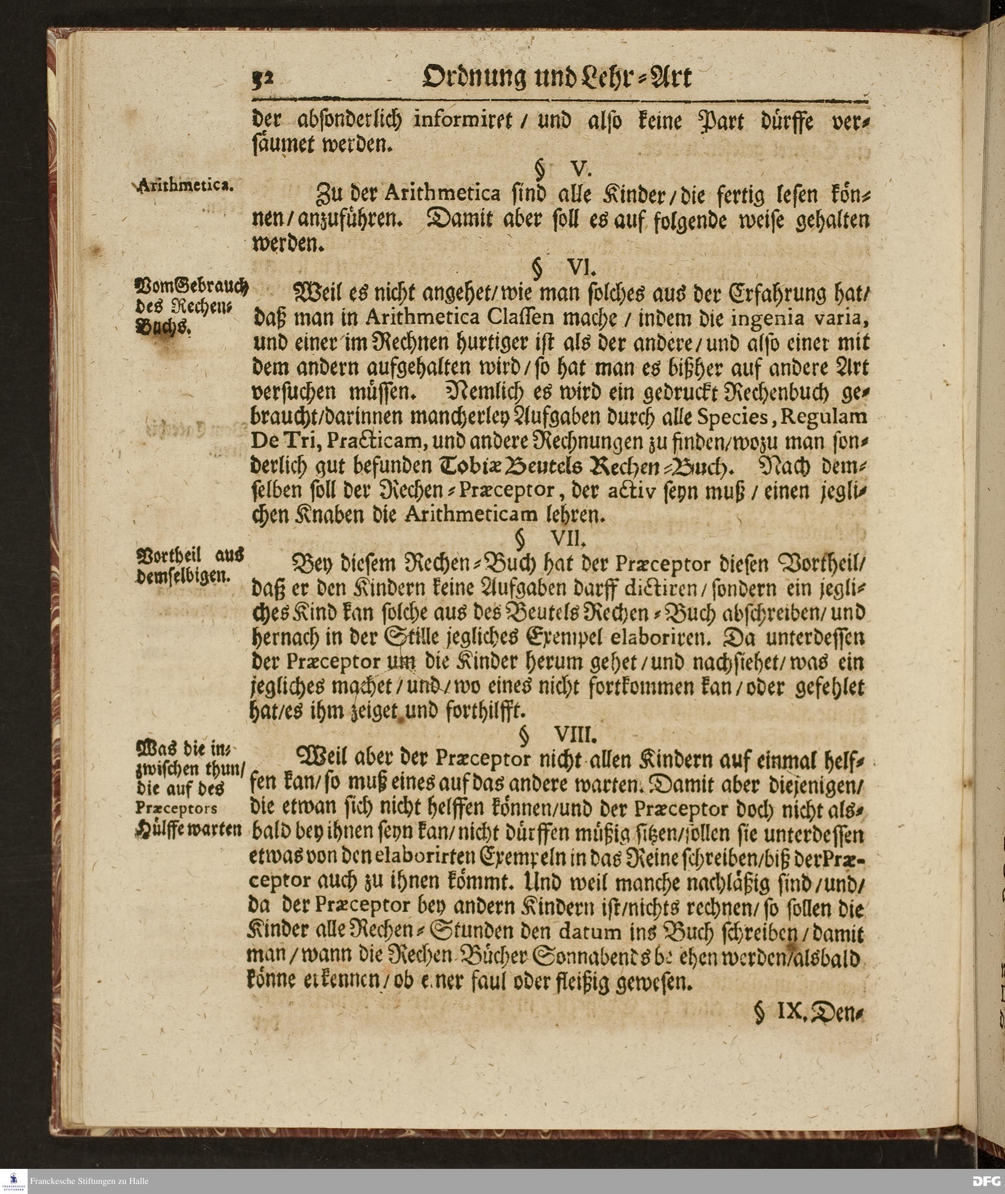 Ordnung und Lehr=Art / Wie selbige in denen zum Wäysen=Hause gehörigen Schulen eingeführet ist / Worinnen vornemlich zu befinden / Wie die Kinder in und ausser der Schul in Christlicher Zucht zu halten / und zum Lesen / zierlichen Schreiben / Rechnen / wie auch zur Music und andern nützlichen Dingen anzuführen sind / entworffen von August Hermann Francken / S.Theol.Prof.Ord.& Past. HALLE / Gedruckt im Wäysen=Hause / 1702.