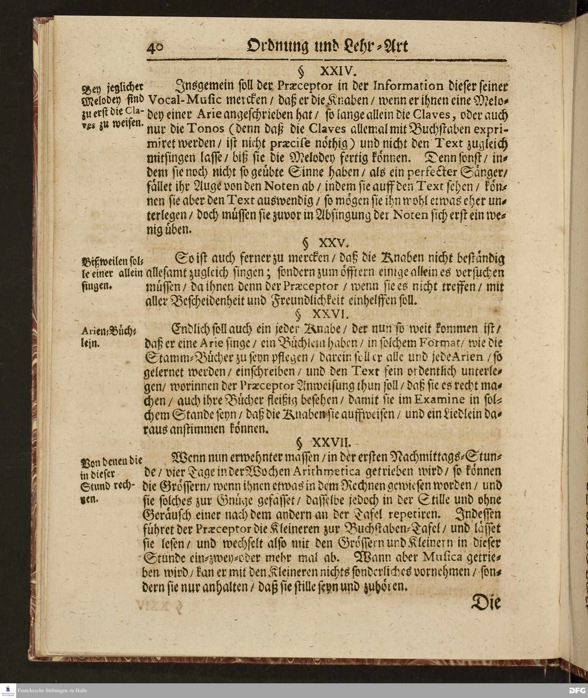 Ordnung und Lehr=Art / Wie selbige in denen zum Wäysen=Hause gehörigen Schulen eingeführet ist / Worinnen vornemlich zu befinden / Wie die Kinder in und ausser der Schul in Christlicher Zucht zu halten / und zum Lesen / zierlichen Schreiben / Rechnen / wie auch zur Music und andern nützlichen Dingen anzuführen sind / entworffen von August Hermann Francken / S.Theol.Prof.Ord.& Past. HALLE / Gedruckt im Wäysen=Hause / 1702.