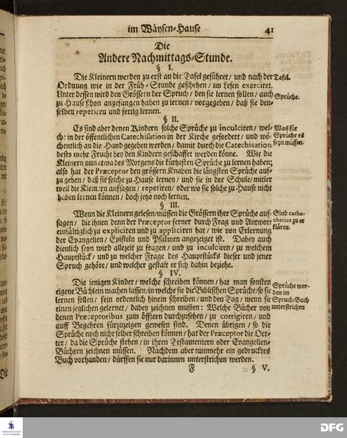 Ordnung und Lehr=Art / Wie selbige in denen zum Wäysen=Hause gehörigen Schulen eingeführet ist / Worinnen vornemlich zu befinden / Wie die Kinder in und ausser der Schul in Christlicher Zucht zu halten / und zum Lesen / zierlichen Schreiben / Rechnen / wie auch zur Music und andern nützlichen Dingen anzuführen sind / entworffen von August Hermann Francken / S.Theol.Prof.Ord.& Past. HALLE / Gedruckt im Wäysen=Hause / 1702.