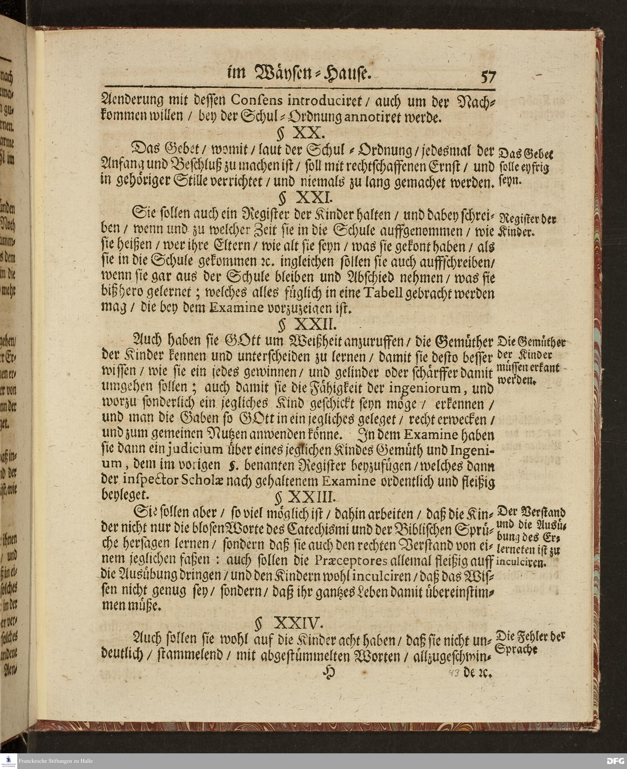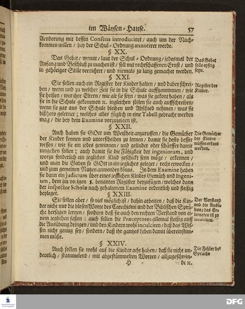 Ordnung und Lehr=Art / Wie selbige in denen zum Wäysen=Hause gehörigen Schulen eingeführet ist / Worinnen vornemlich zu befinden / Wie die Kinder in und ausser der Schul in Christlicher Zucht zu halten / und zum Lesen / zierlichen Schreiben / Rechnen / wie auch zur Music und andern nützlichen Dingen anzuführen sind / entworffen von August Hermann Francken / S.Theol.Prof.Ord.& Past. HALLE / Gedruckt im Wäysen=Hause / 1702.