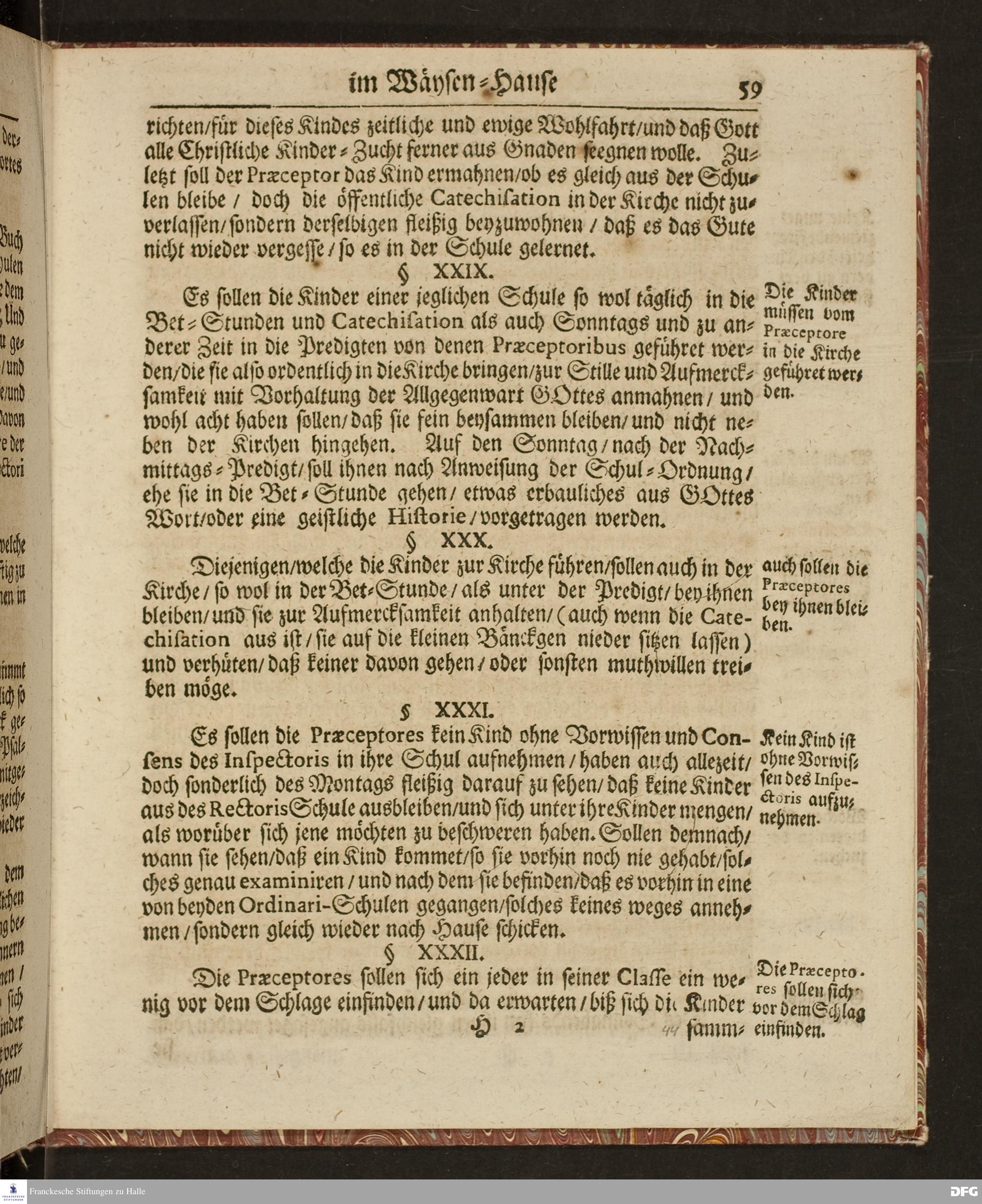Ordnung und Lehr=Art / Wie selbige in denen zum Wäysen=Hause gehörigen Schulen eingeführet ist / Worinnen vornemlich zu befinden / Wie die Kinder in und ausser der Schul in Christlicher Zucht zu halten / und zum Lesen / zierlichen Schreiben / Rechnen / wie auch zur Music und andern nützlichen Dingen anzuführen sind / entworffen von August Hermann Francken / S.Theol.Prof.Ord.& Past. HALLE / Gedruckt im Wäysen=Hause / 1702.