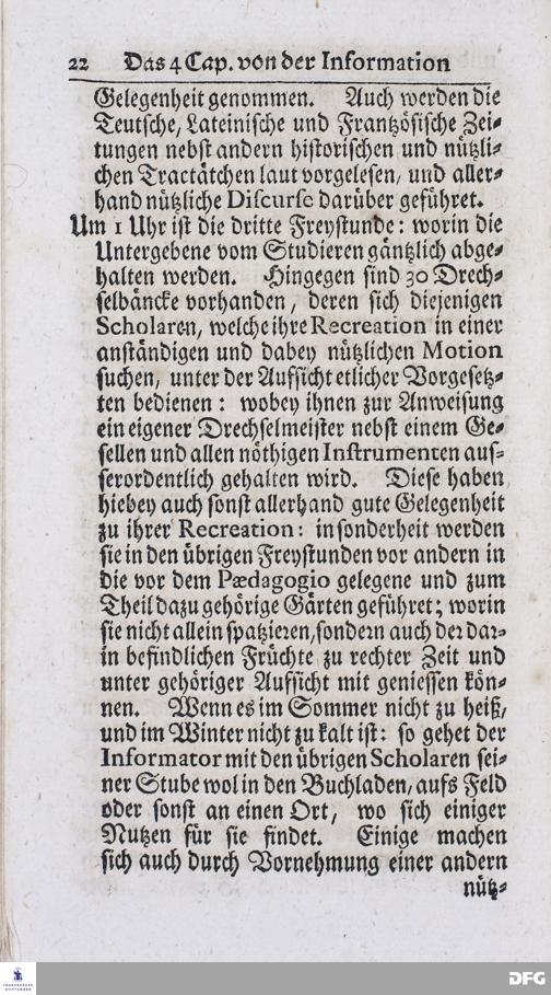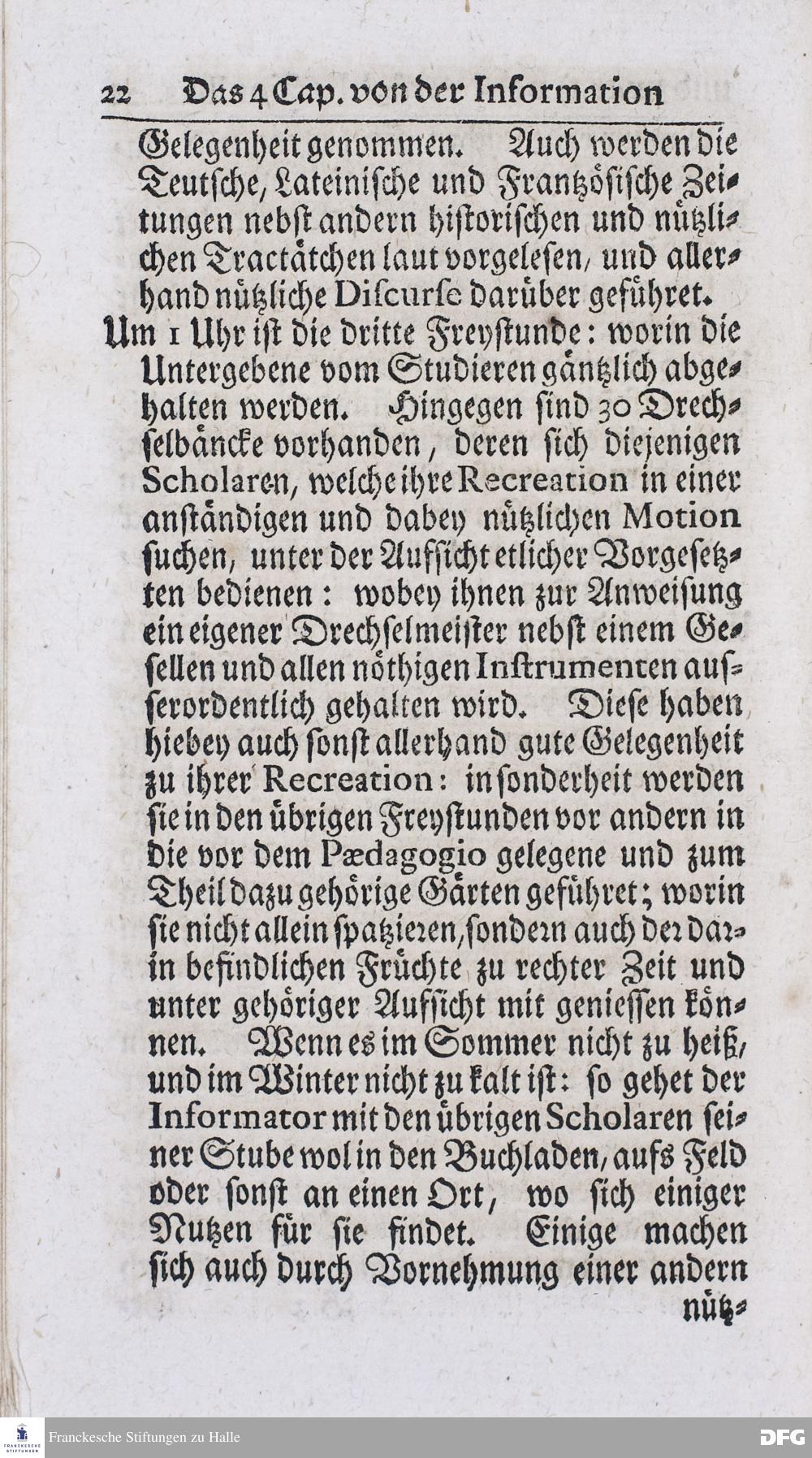 Kurtzer Bericht Von der Gegenwärtigen Verfassung Des PAEDAGOGII REGII Zu Glaucha vor Halle / Zum Dienst derer / Welche Nachfrage zu thun pflegen / Im Druck vorgeleget Von dem DIRECTORE desselben / August Hermann Francken / S.S.Theol.P.P.Ord.Past.Vlric.und Scholarcha. HALLE, Zu finden im Waisenhause, 1720.
