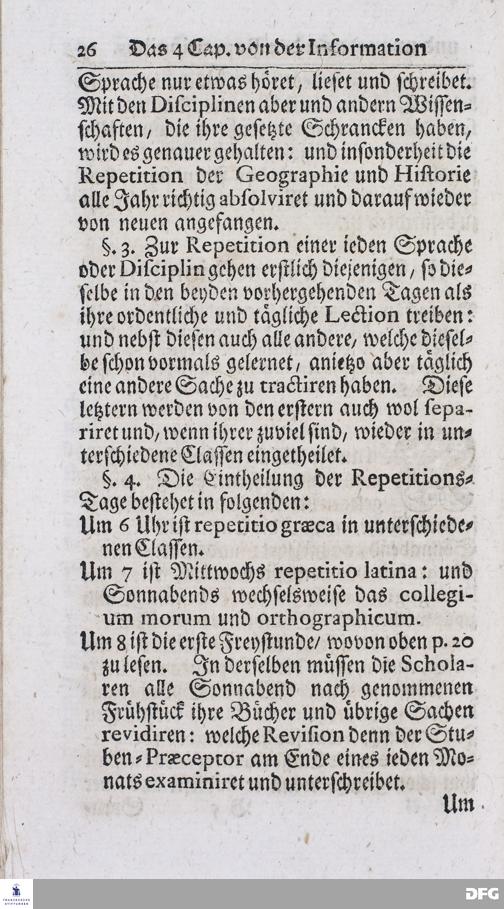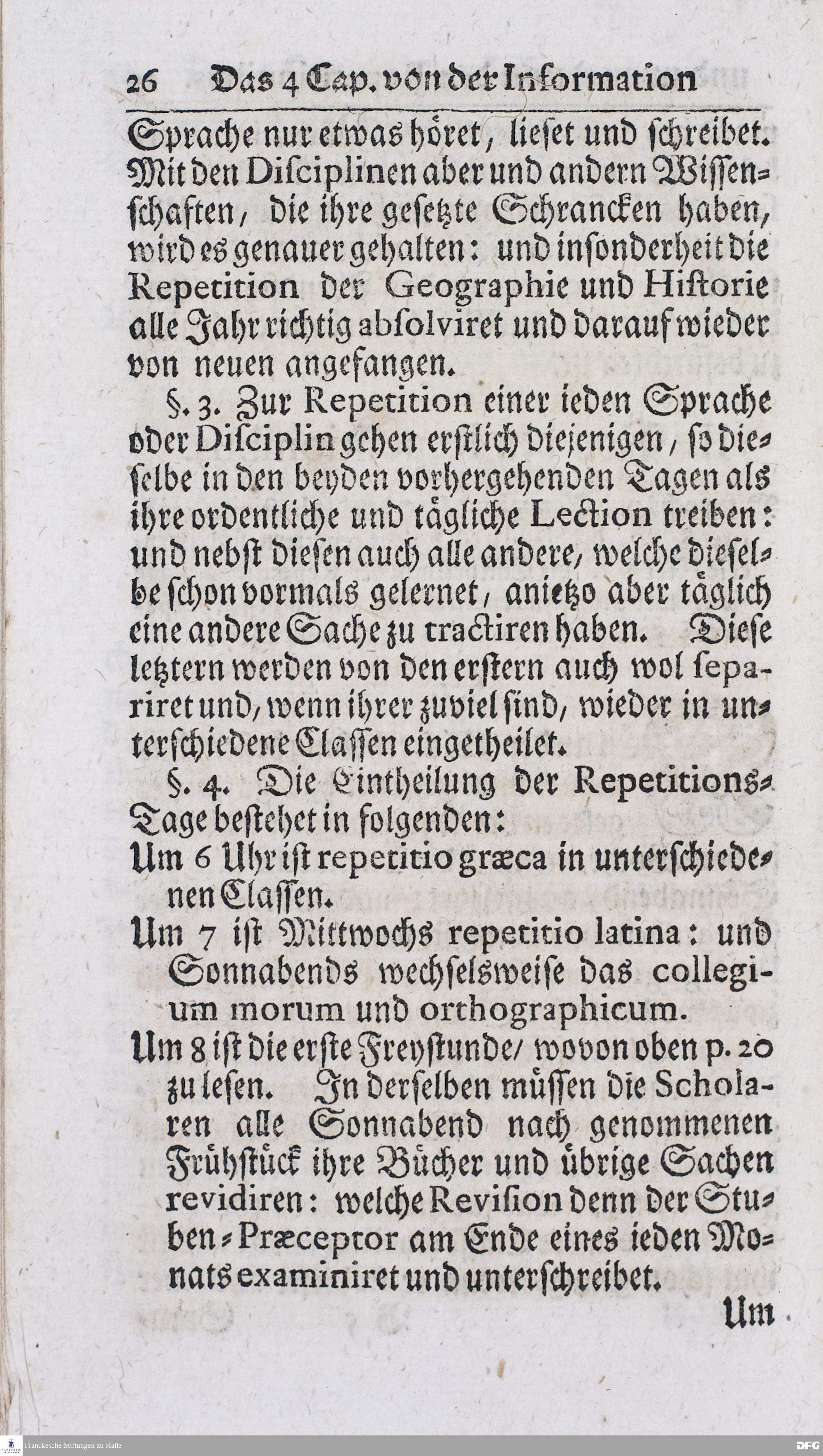 Kurtzer Bericht Von der Gegenwärtigen Verfassung Des PAEDAGOGII REGII Zu Glaucha vor Halle / Zum Dienst derer / Welche Nachfrage zu thun pflegen / Im Druck vorgeleget Von dem DIRECTORE desselben / August Hermann Francken / S.S.Theol.P.P.Ord.Past.Vlric.und Scholarcha. HALLE, Zu finden im Waisenhause, 1720.