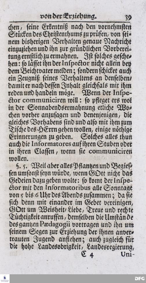 Kurtzer Bericht Von der Gegenwärtigen Verfassung Des PAEDAGOGII REGII Zu Glaucha vor Halle / Zum Dienst derer / Welche Nachfrage zu thun pflegen / Im Druck vorgeleget Von dem DIRECTORE desselben / August Hermann Francken / S.S.Theol.P.P.Ord.Past.Vlric.und Scholarcha. HALLE, Zu finden im Waisenhause, 1720.