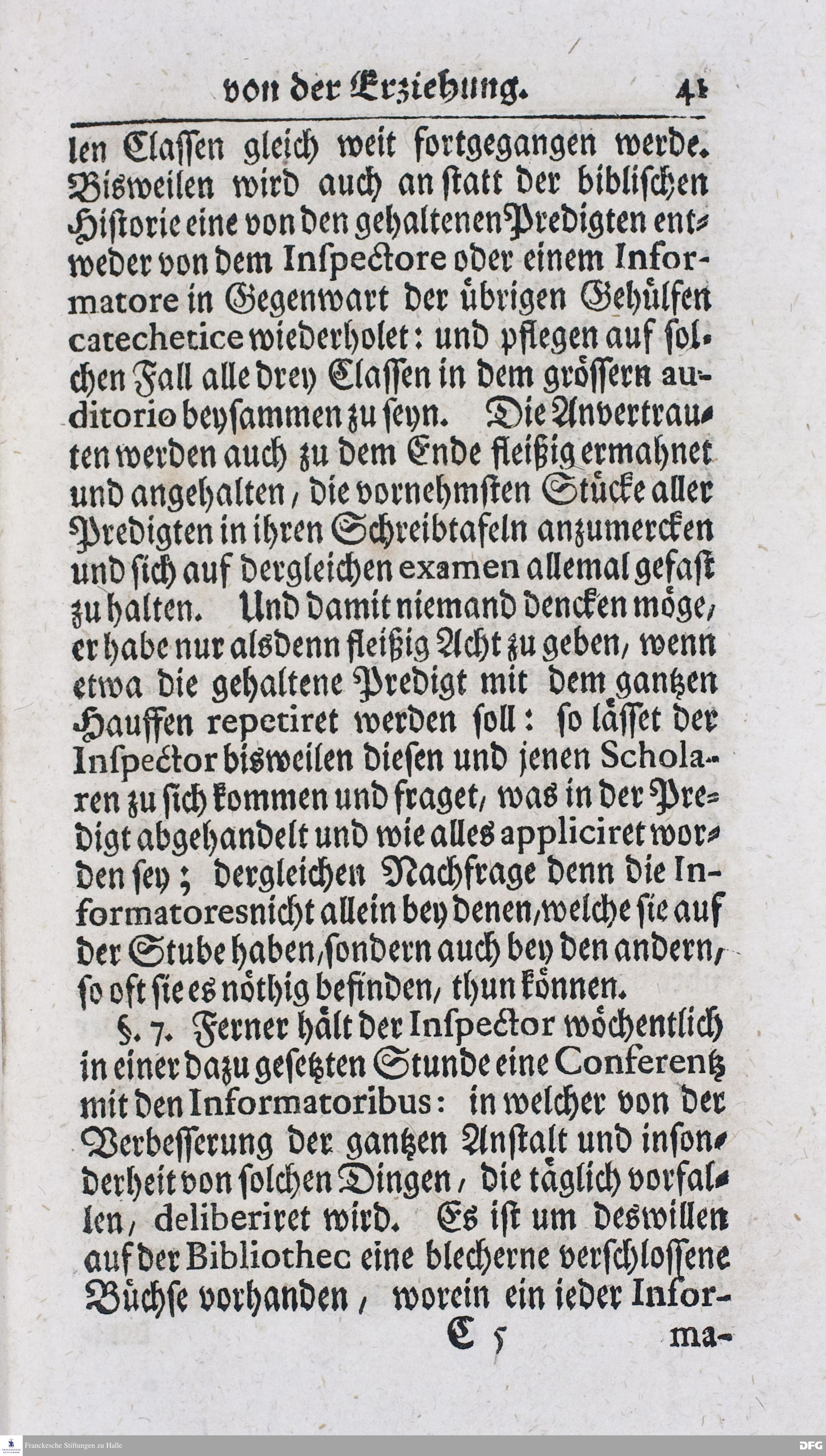 Kurtzer Bericht Von der Gegenwärtigen Verfassung Des PAEDAGOGII REGII Zu Glaucha vor Halle / Zum Dienst derer / Welche Nachfrage zu thun pflegen / Im Druck vorgeleget Von dem DIRECTORE desselben / August Hermann Francken / S.S.Theol.P.P.Ord.Past.Vlric.und Scholarcha. HALLE, Zu finden im Waisenhause, 1720.