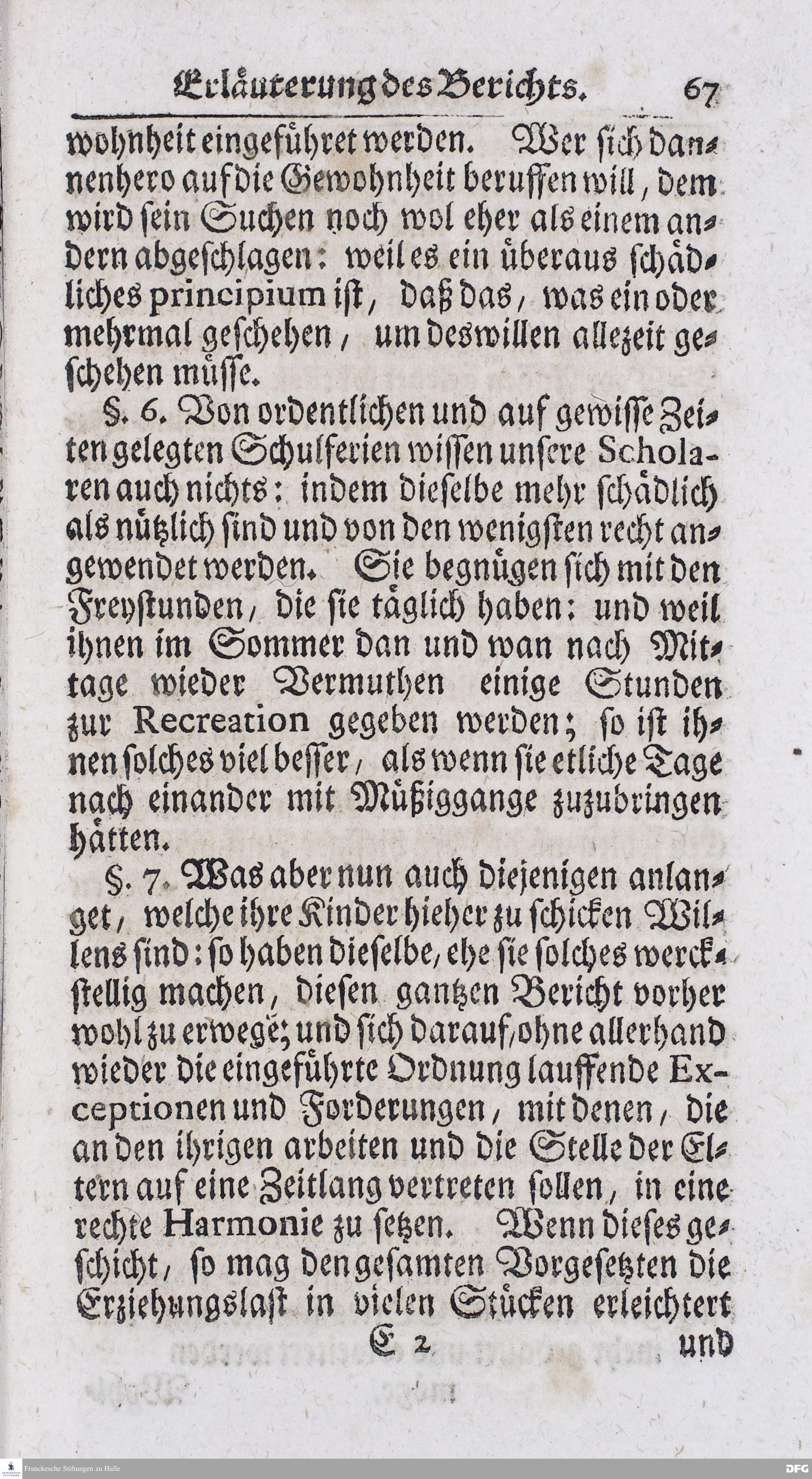 Kurtzer Bericht Von der Gegenwärtigen Verfassung Des PAEDAGOGII REGII Zu Glaucha vor Halle / Zum Dienst derer / Welche Nachfrage zu thun pflegen / Im Druck vorgeleget Von dem DIRECTORE desselben / August Hermann Francken / S.S.Theol.P.P.Ord.Past.Vlric.und Scholarcha. HALLE, Zu finden im Waisenhause, 1720.