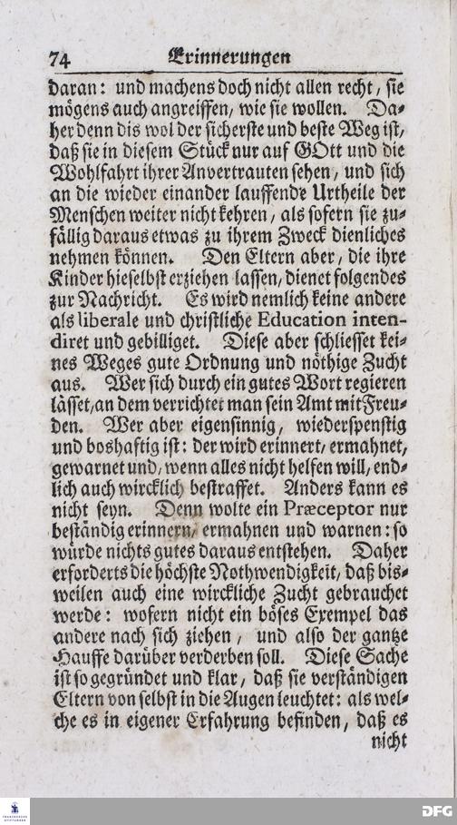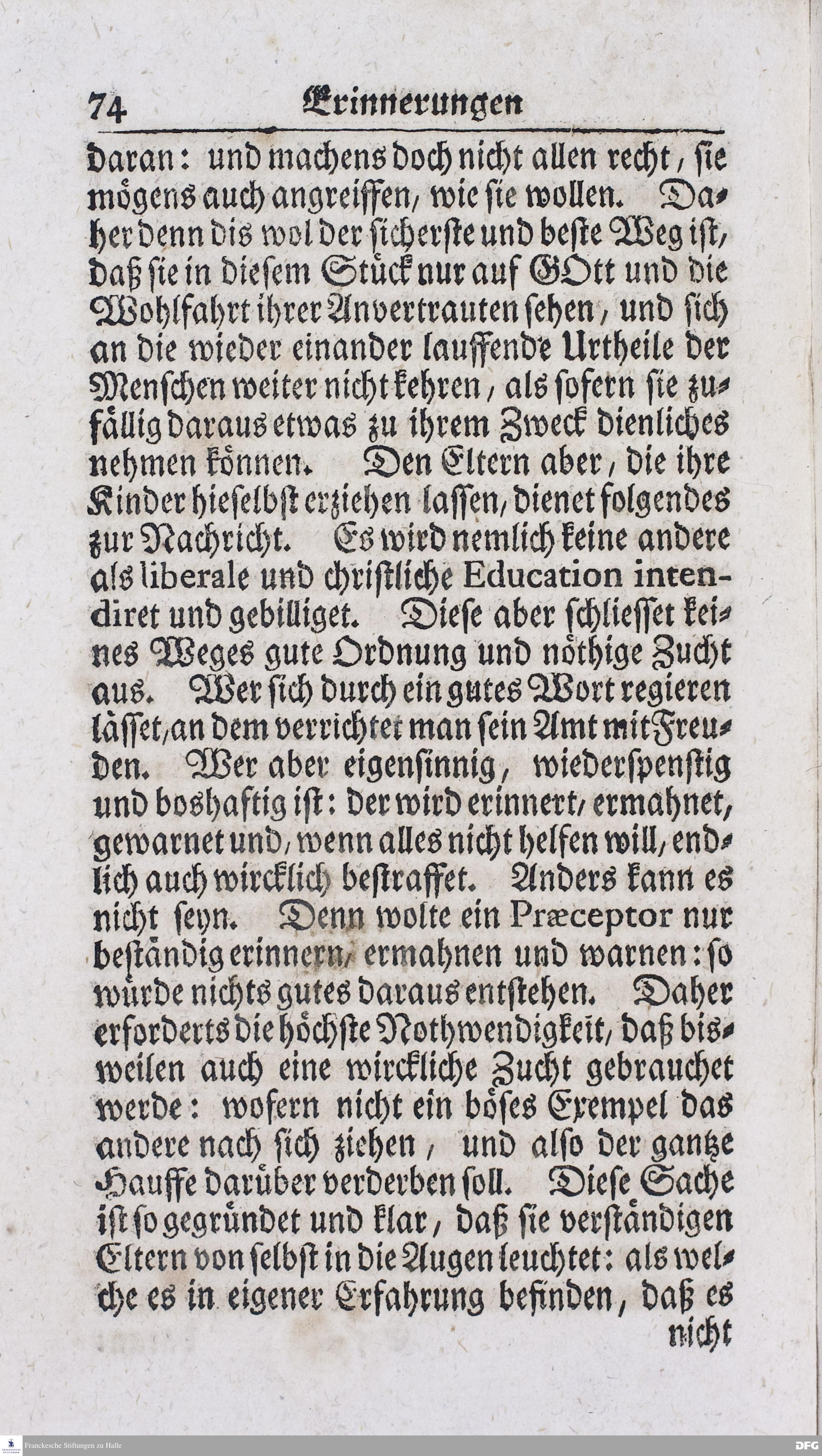 Kurtzer Bericht Von der Gegenwärtigen Verfassung Des PAEDAGOGII REGII Zu Glaucha vor Halle / Zum Dienst derer / Welche Nachfrage zu thun pflegen / Im Druck vorgeleget Von dem DIRECTORE desselben / August Hermann Francken / S.S.Theol.P.P.Ord.Past.Vlric.und Scholarcha. HALLE, Zu finden im Waisenhause, 1720.