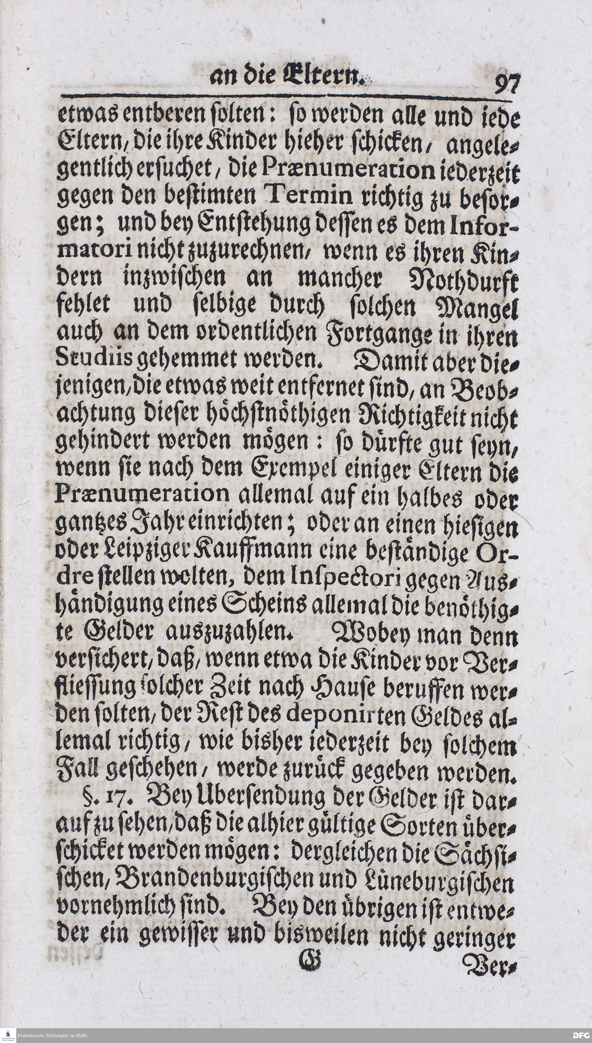 Kurtzer Bericht Von der Gegenwärtigen Verfassung Des PAEDAGOGII REGII Zu Glaucha vor Halle / Zum Dienst derer / Welche Nachfrage zu thun pflegen / Im Druck vorgeleget Von dem DIRECTORE desselben / August Hermann Francken / S.S.Theol.P.P.Ord.Past.Vlric.und Scholarcha. HALLE, Zu finden im Waisenhause, 1720.