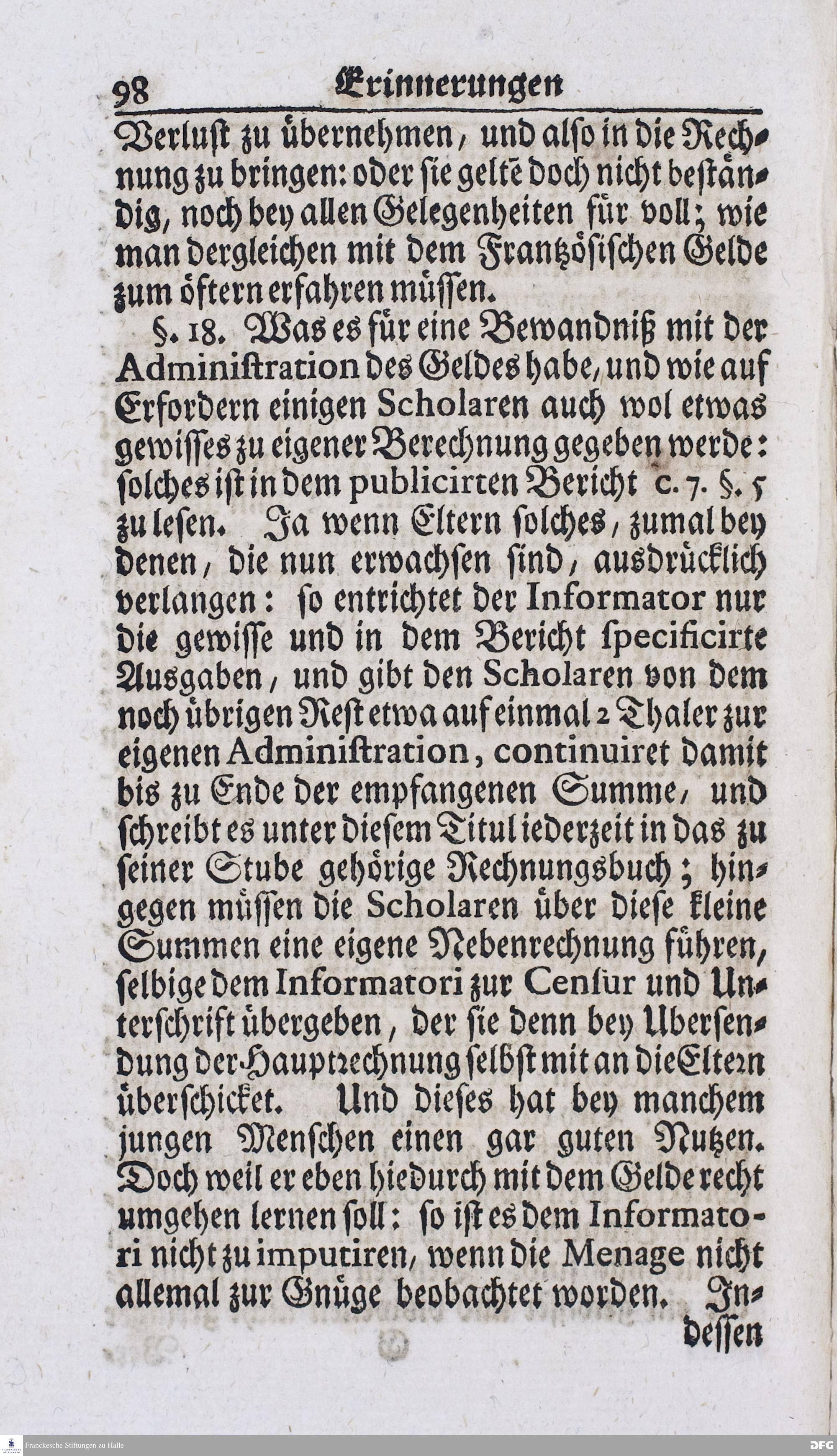 Kurtzer Bericht Von der Gegenwärtigen Verfassung Des PAEDAGOGII REGII Zu Glaucha vor Halle / Zum Dienst derer / Welche Nachfrage zu thun pflegen / Im Druck vorgeleget Von dem DIRECTORE desselben / August Hermann Francken / S.S.Theol.P.P.Ord.Past.Vlric.und Scholarcha. HALLE, Zu finden im Waisenhause, 1720.