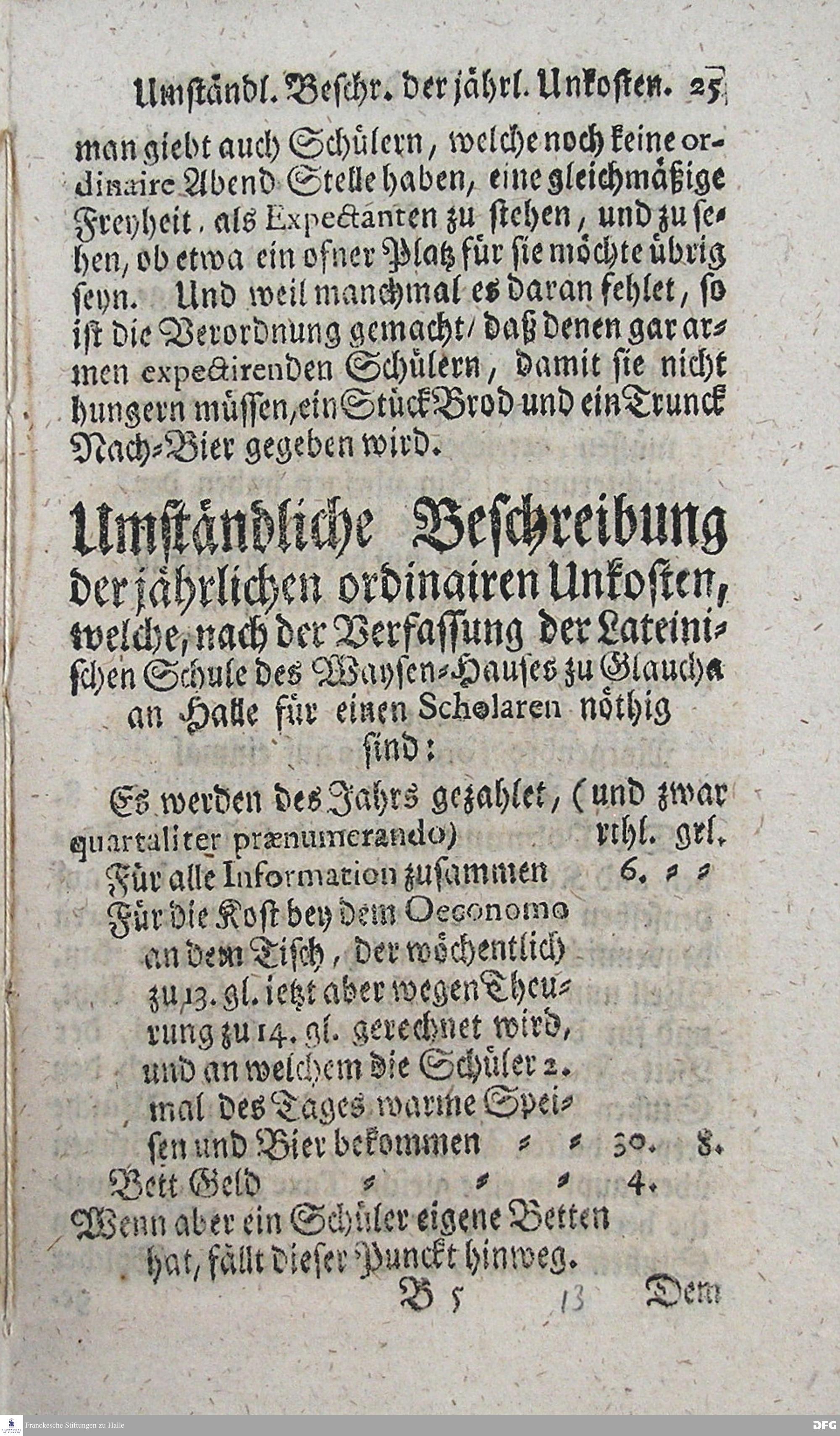Kurtzer Bericht von der Gegenwärtigen Einrichtung Und Beschaffenheit Der Lateinischen Schule des Waysenhauses zu Glaucha an Halle, samt angehängten Nöthigen Erinnerungen An die lieben Eltern der Scholaren; Wie auch Eine Summarische Anzeige Der zur jährlichen Unterhaltung erforderlichen Kosten: Zum Dienst derer, Welche Nachfrage zu thun pflegen, im Druck vorgeleget Von dem Directore der gesammten Anstalten August Hermann Francken, SS.Theol.P.P.Ord.Past.Vlric. und Scholarcha. HALLE / zu finden im Waysenhause. MDCCXX.