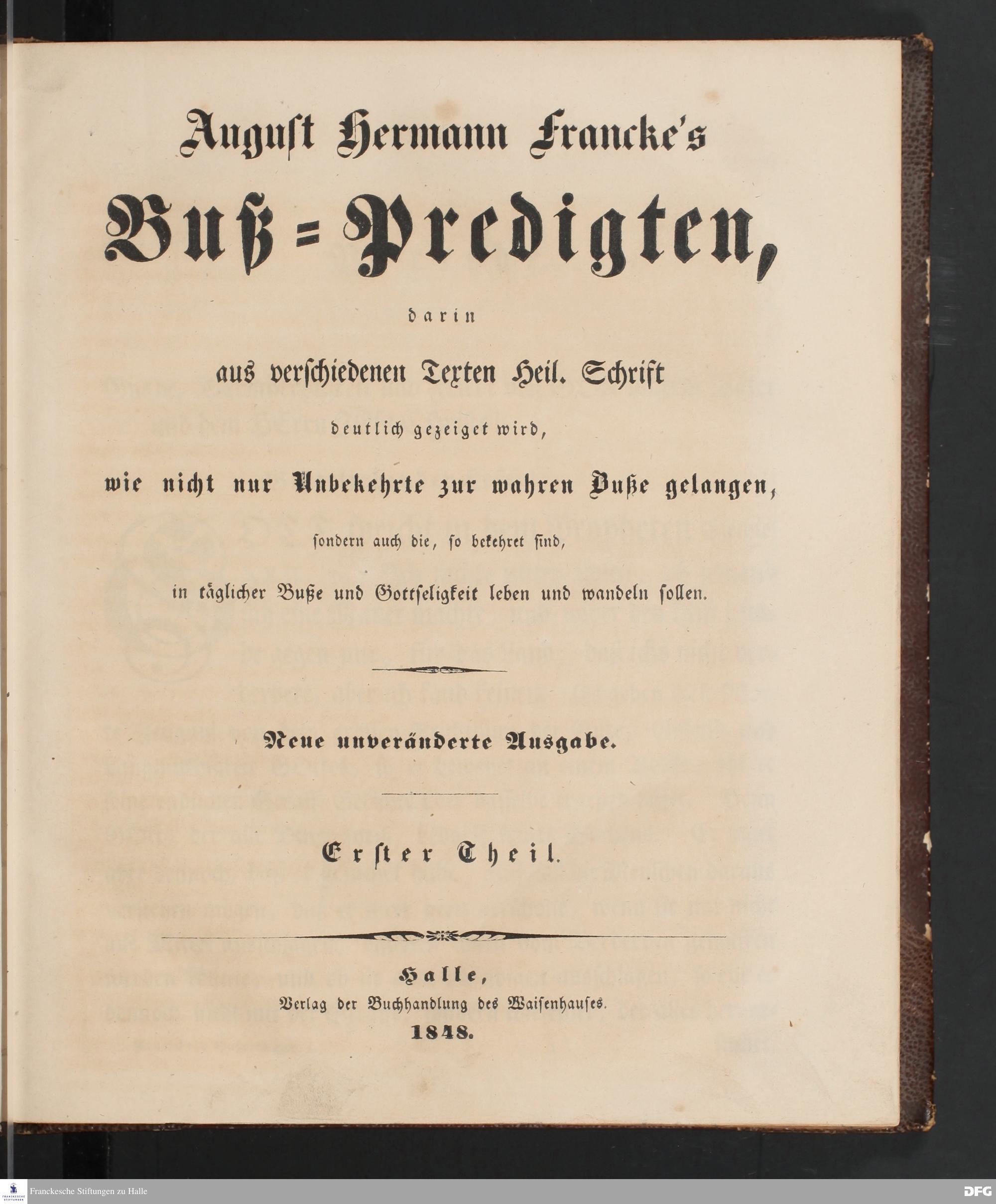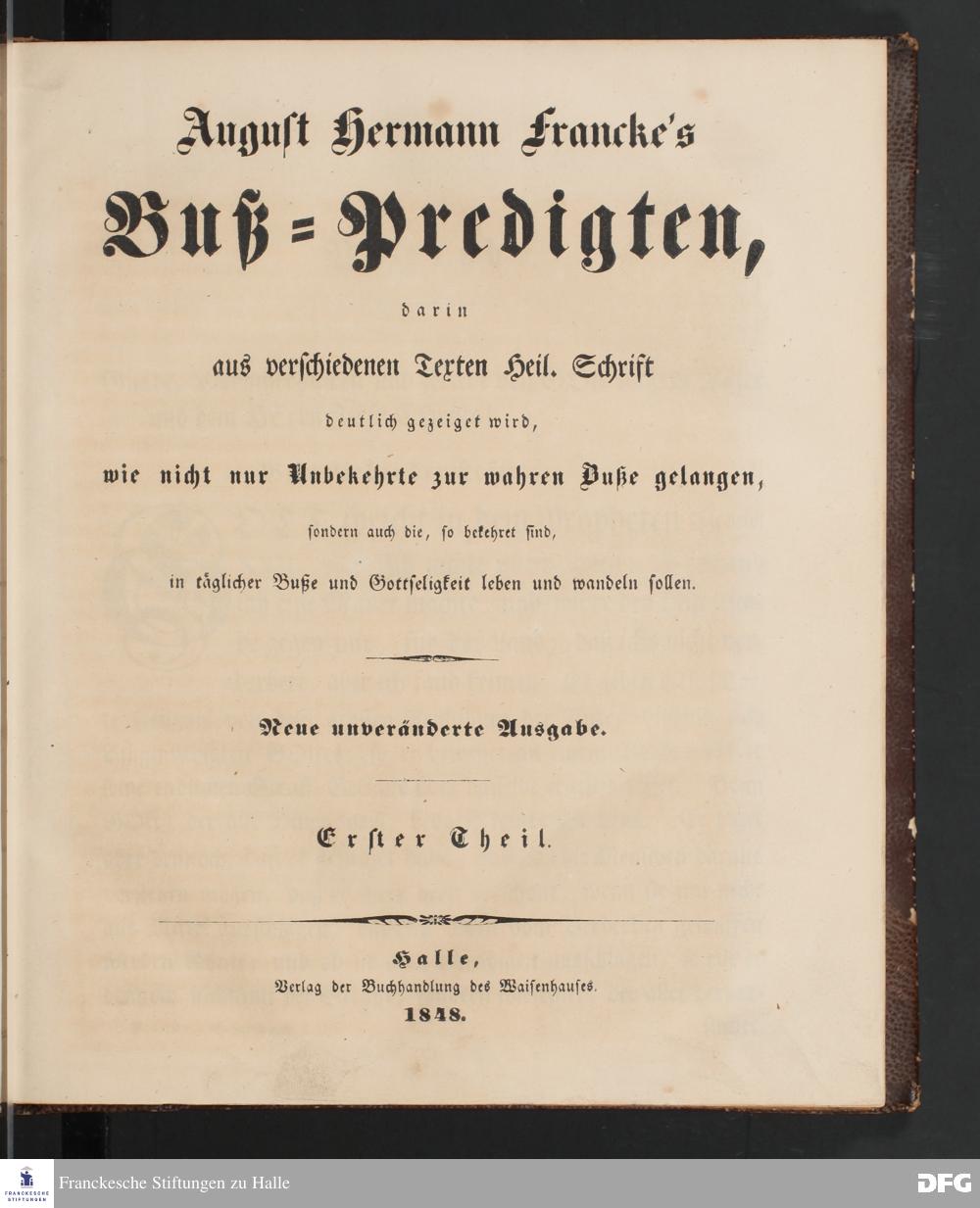 August Hermann Francke's Buß=Predigten, darin aus verschiedenen Texten Heil. Schrift deutlich gezeiget wird, wie nicht nur Unbekehrte zur wahren Buße gelangen, sondern auch die, so bekehret sind, in täglicher Buße und Gottseligkeit leben und wandeln sollen. Neue unveränderte Ausgabe. Erster [und Zweiter] Theil. Halle, Verlag der Buchhandlung des Waisenhauses. 1848.