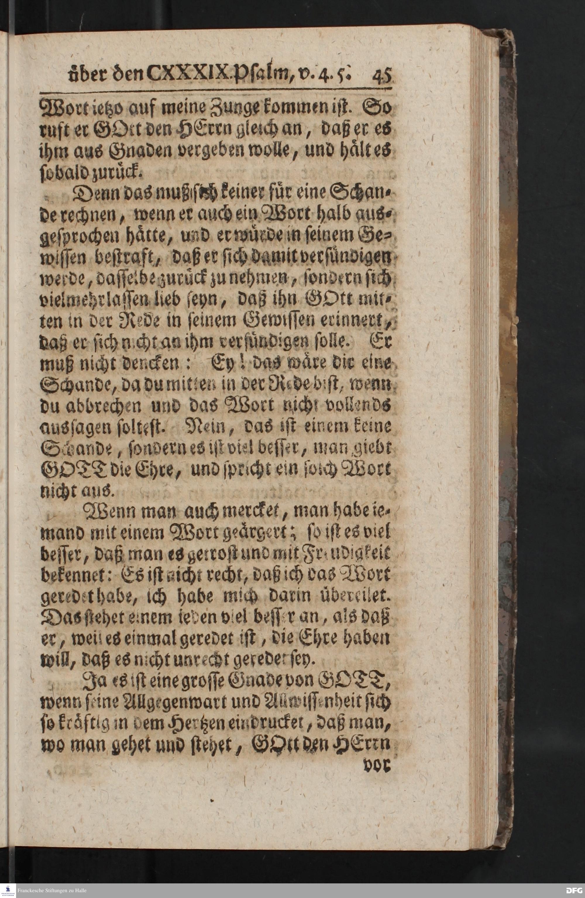 August Hermann Franckens, Weyl.Prof.Theol.Past.Ulr.und Schol. Erklärung Des hundert und neun und dreyßigsten Psalms / Auf Verlangen besonders herausgegeben Von Gotthilf August Francken, S.Theol.Prof.Ord.der ersten Dioeces des Saal=Creyses Insp.u.Pred.zur L.Fr. Andere Auflage. HALLE, In Verlegung des Wäysenhauses, 1739.