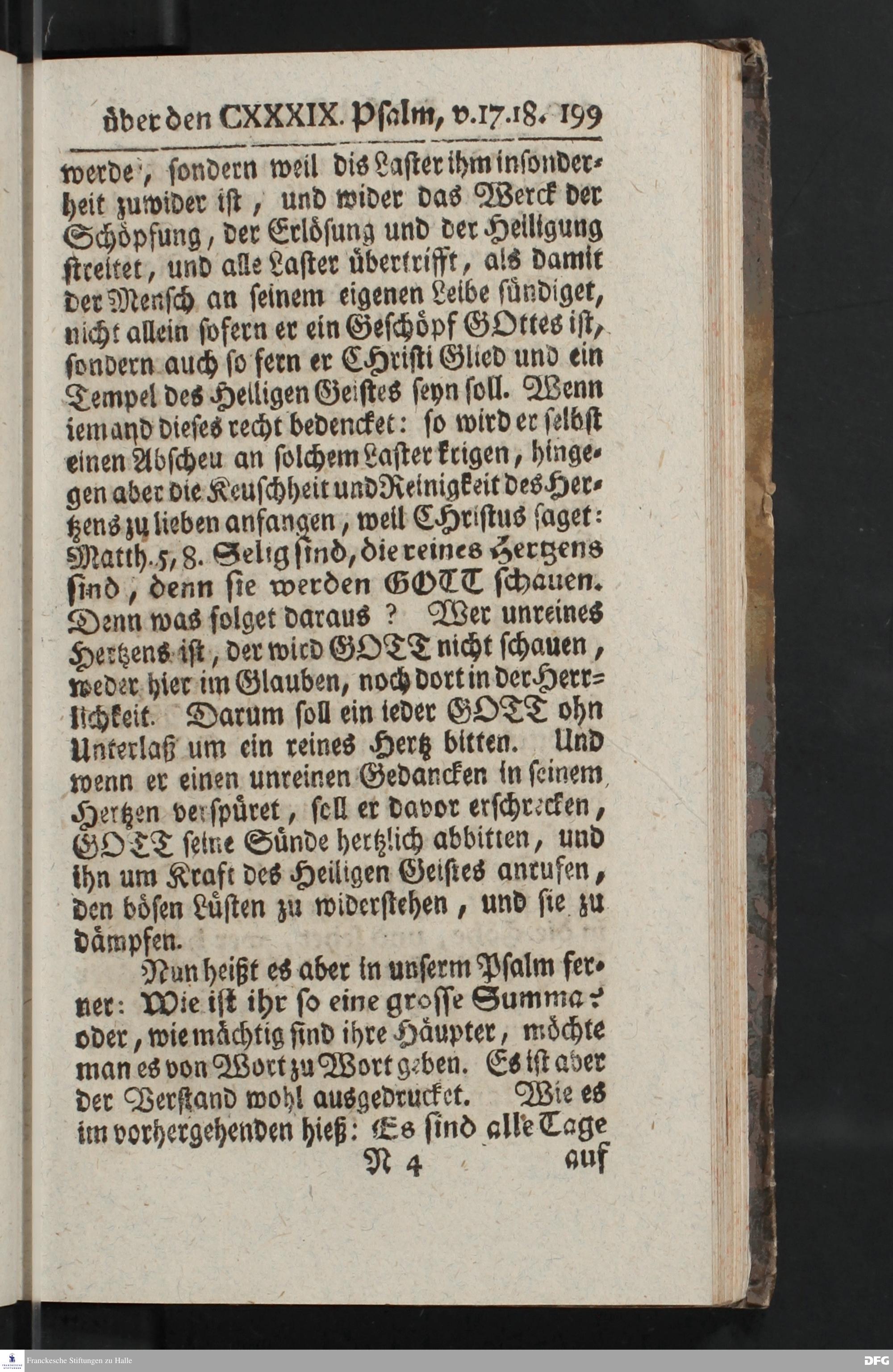 August Hermann Franckens, Weyl.Prof.Theol.Past.Ulr.und Schol. Erklärung Des hundert und neun und dreyßigsten Psalms / Auf Verlangen besonders herausgegeben Von Gotthilf August Francken, S.Theol.Prof.Ord.der ersten Dioeces des Saal=Creyses Insp.u.Pred.zur L.Fr. Andere Auflage. HALLE, In Verlegung des Wäysenhauses, 1739.