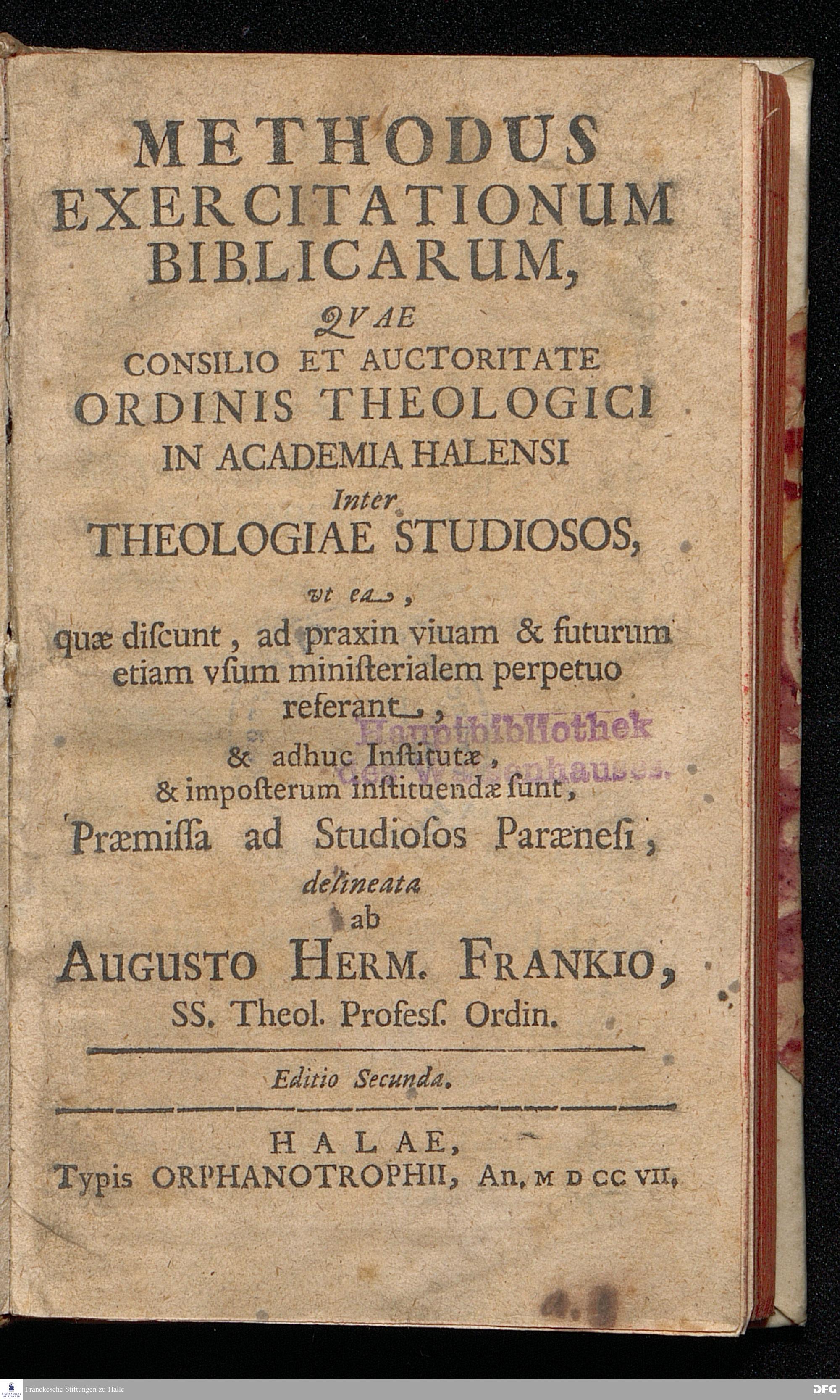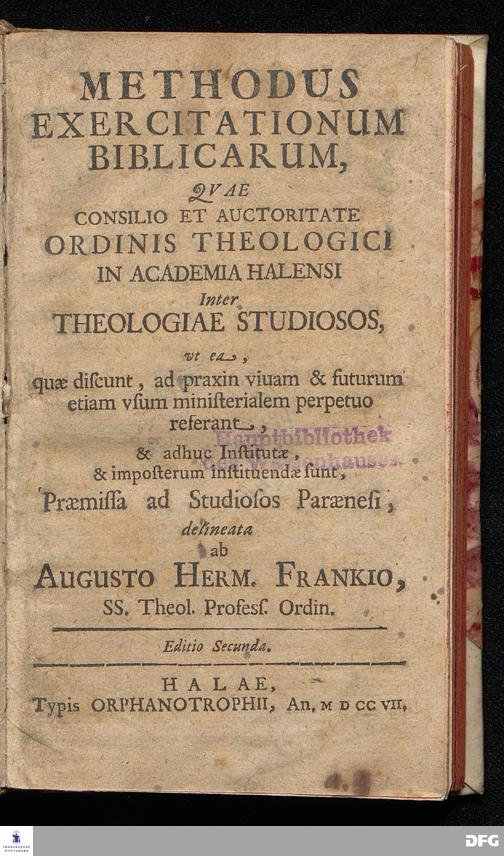 METHODUS EXERCITATIONUM BIBLICARUM, QVAE CONSILIO ET AUCTORITATE ORDINIS THEOLOGICI IN ACADEMIA HALENSI Inter THEOLOGIAE STUDIOSOS, vt ea, quæ discunt, ad praxin viuam & futurum etiam vsum ministerialem perpetuo referant, & adhuc Institutæ, & imposterum instituendæ sunt, Præmissa ad Studiosos Parænesi, delineata ab AUGUSTO HERM. FRANKIO, SS.Theol.Profess.Ordin. Editio Secunda. HALAE, Typis ORPHANOTROPHII, An. MDCCVII.
