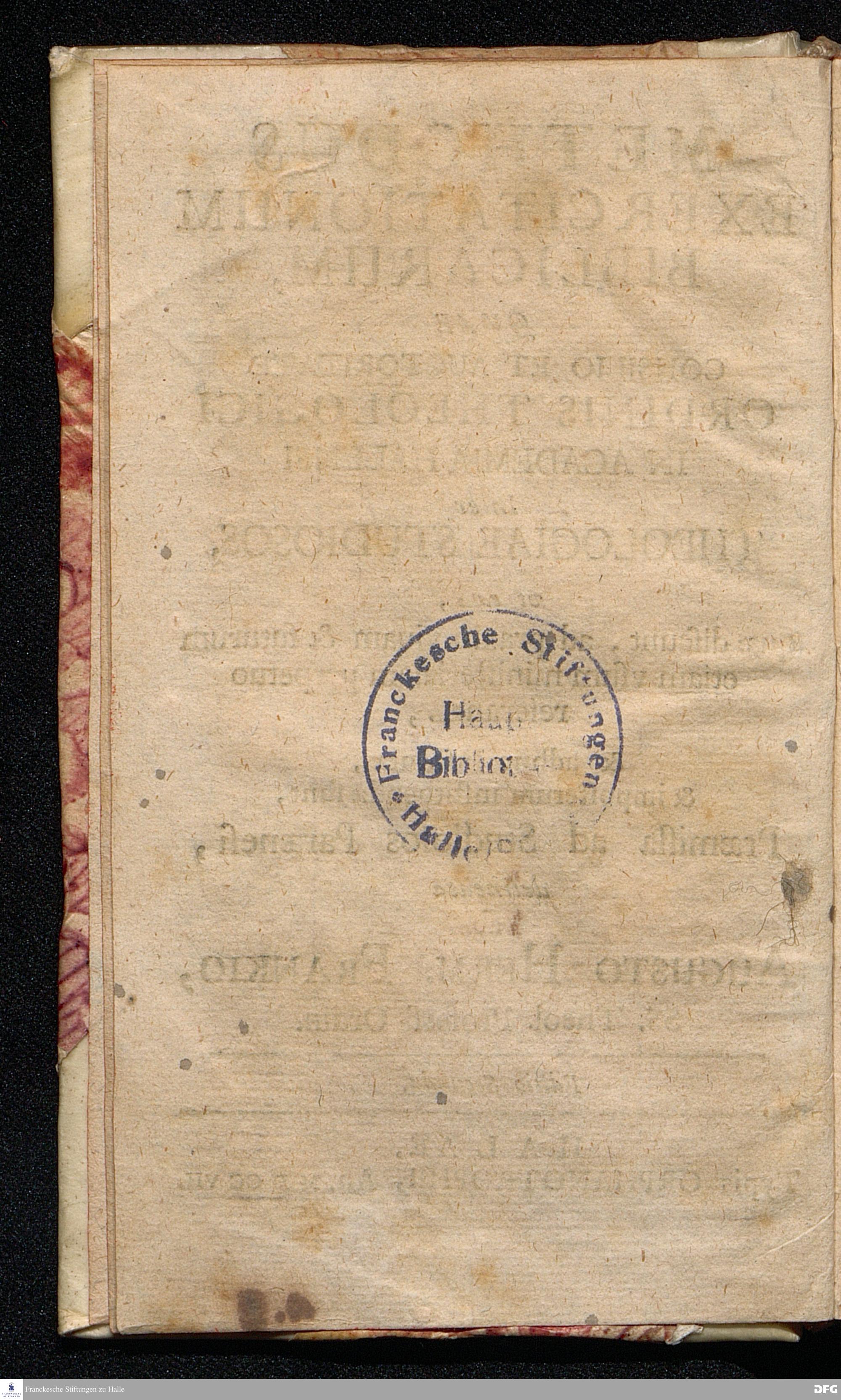 METHODUS EXERCITATIONUM BIBLICARUM, QVAE CONSILIO ET AUCTORITATE ORDINIS THEOLOGICI IN ACADEMIA HALENSI Inter THEOLOGIAE STUDIOSOS, vt ea, quæ discunt, ad praxin viuam & futurum etiam vsum ministerialem perpetuo referant, & adhuc Institutæ, & imposterum instituendæ sunt, Præmissa ad Studiosos Parænesi, delineata ab AUGUSTO HERM. FRANKIO, SS.Theol.Profess.Ordin. Editio Secunda. HALAE, Typis ORPHANOTROPHII, An. MDCCVII.